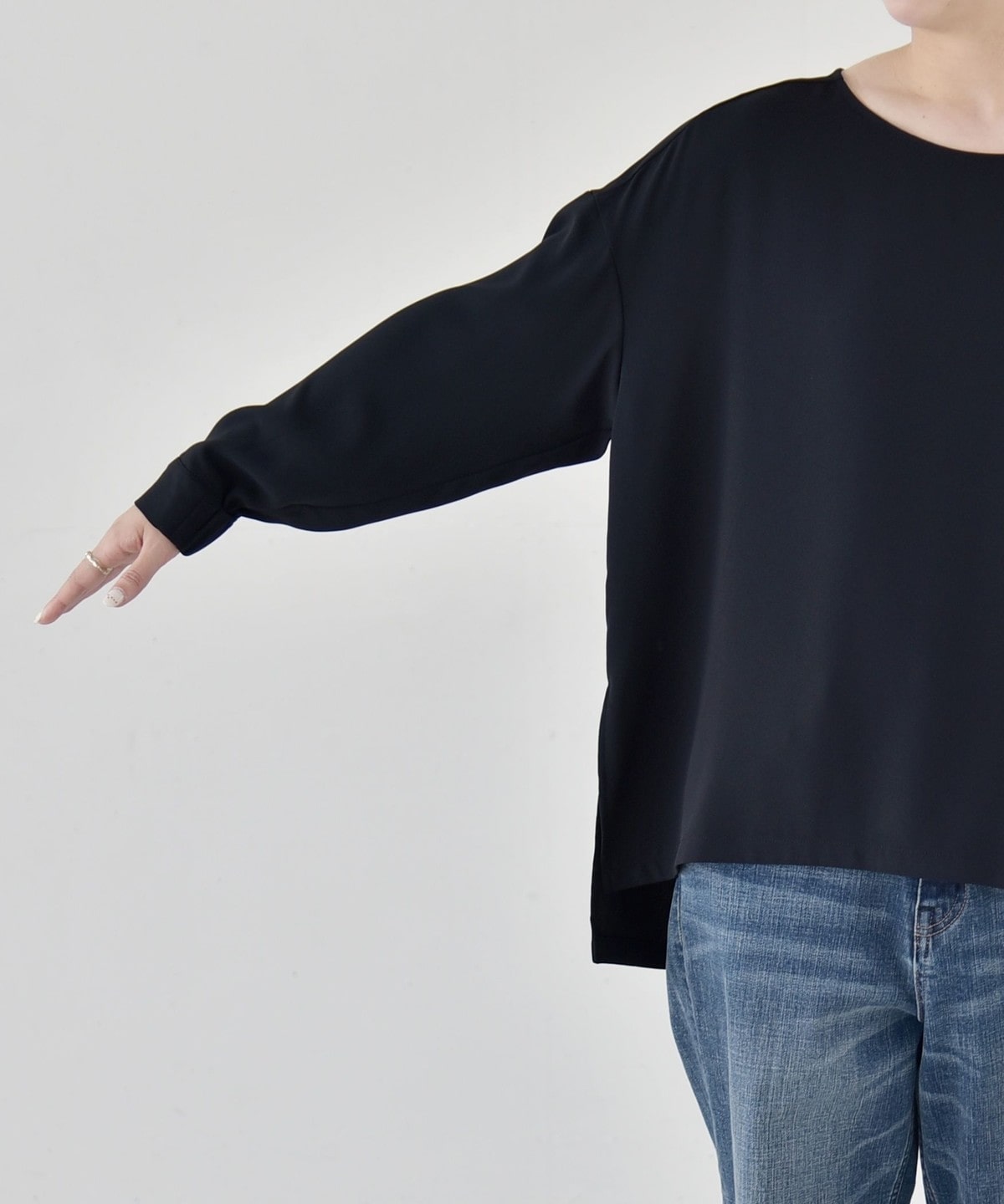全体的にゆったりとしたオーバーサイズですが、袖は太すぎずだらしない印象になりません。