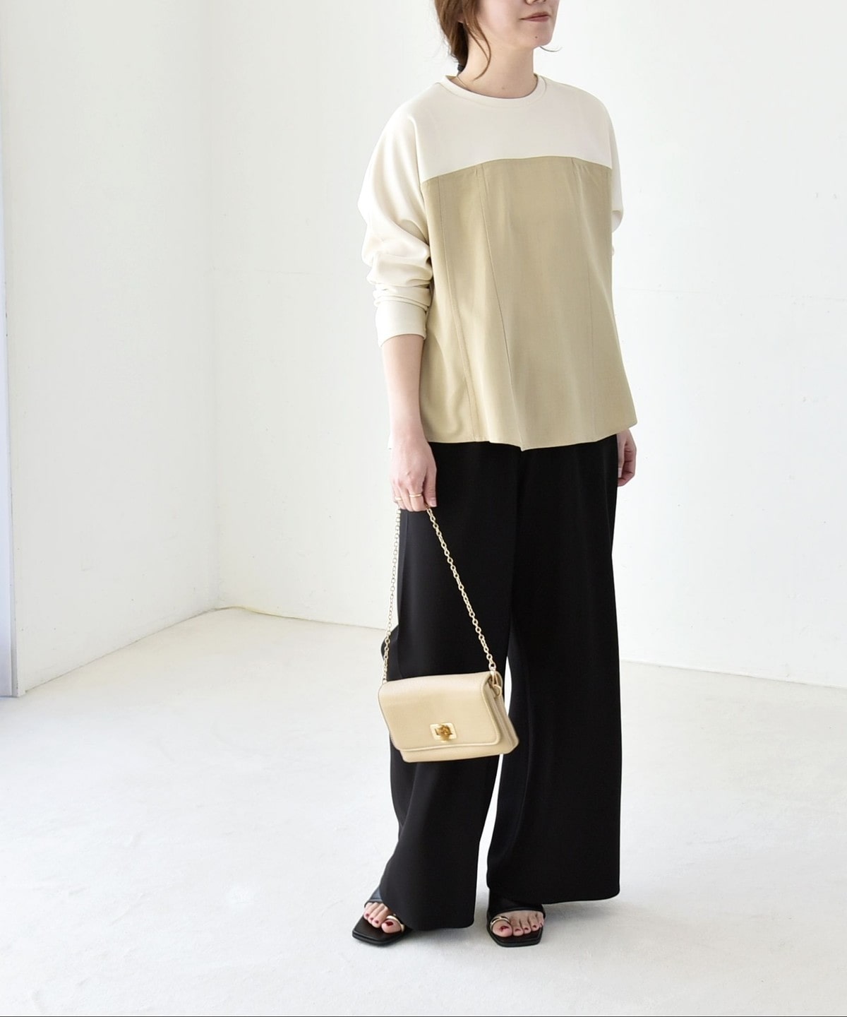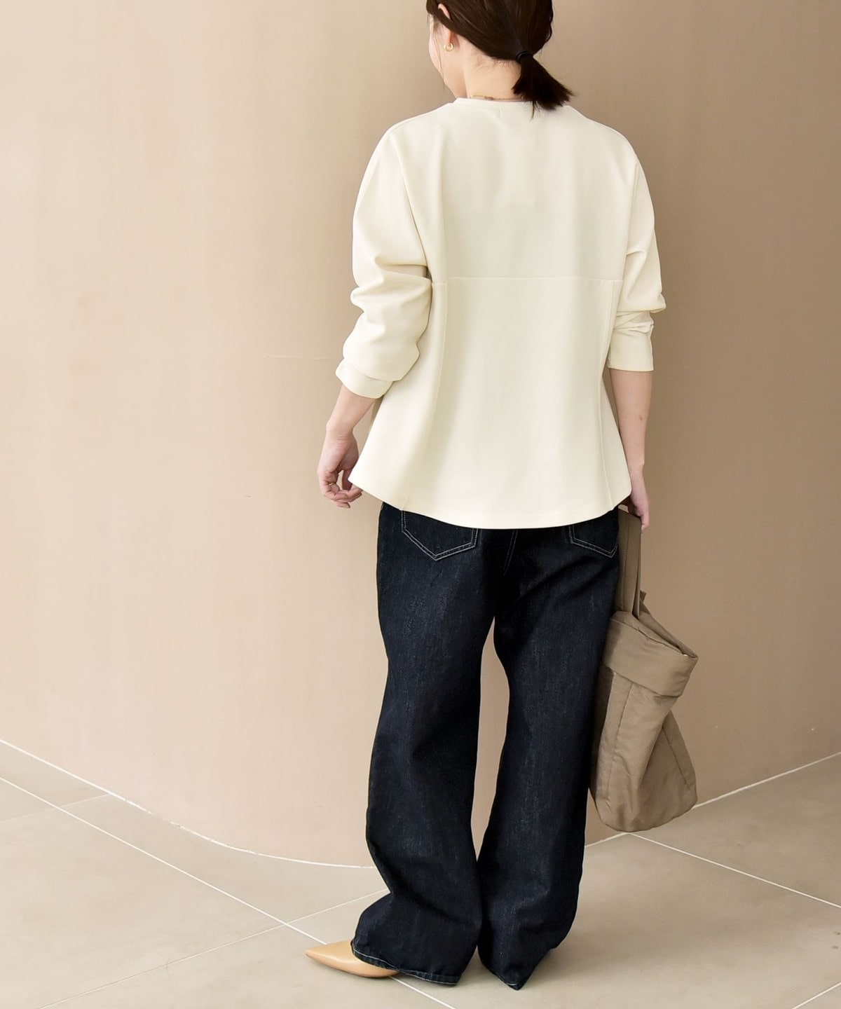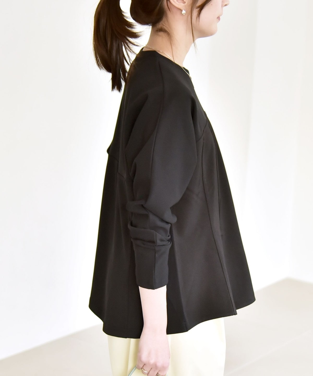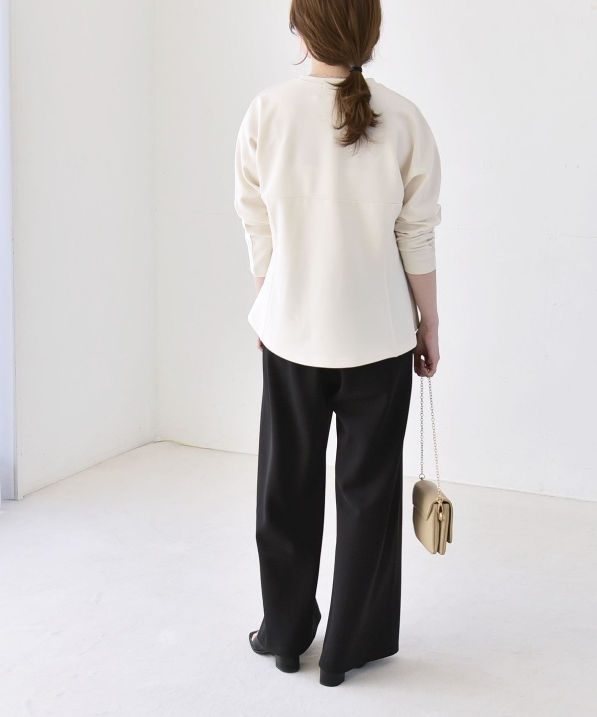伸縮性のある素材でリラクシーな着心地ながら綺麗見えし、オンオフ兼用で活躍するカットソーです。