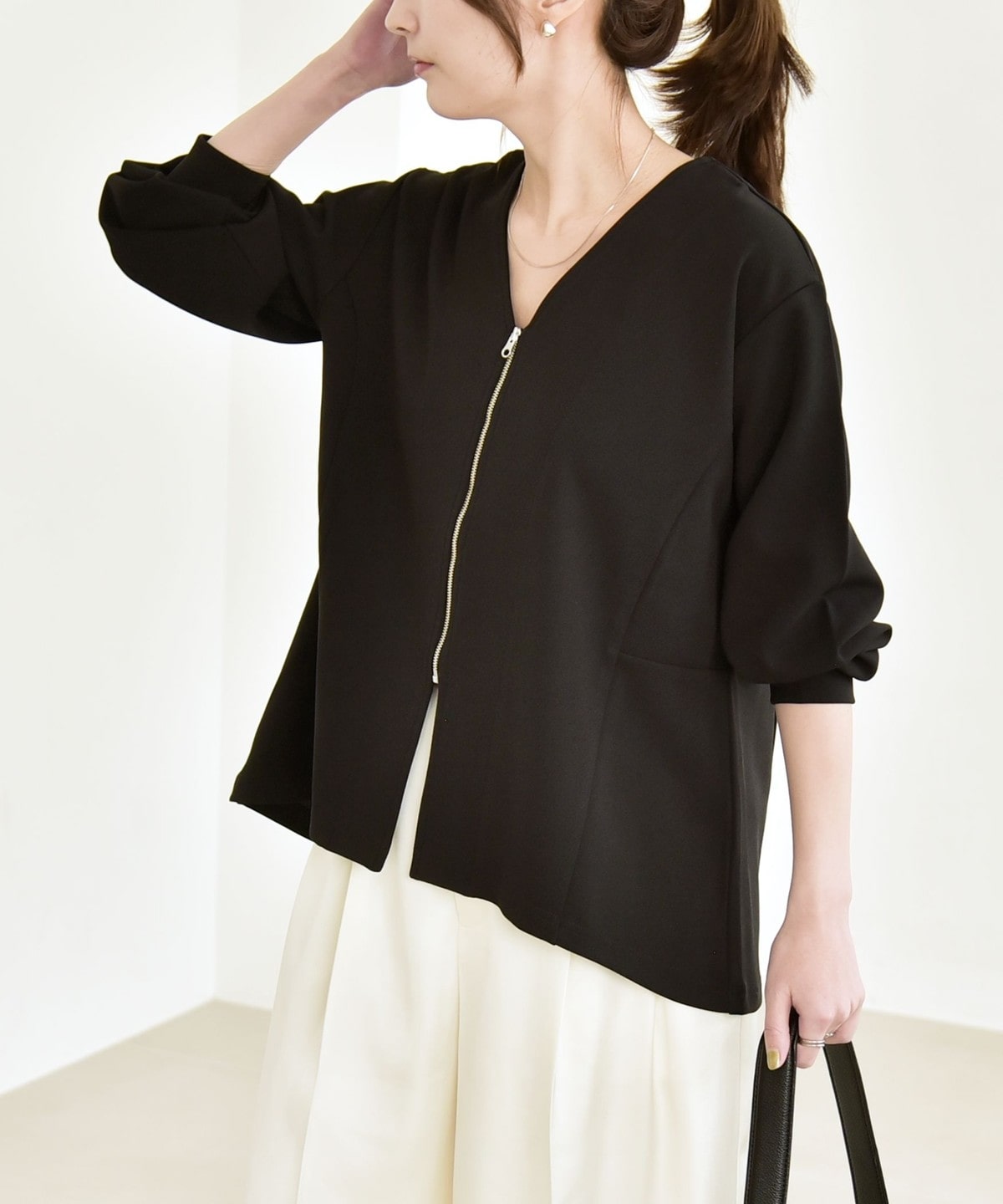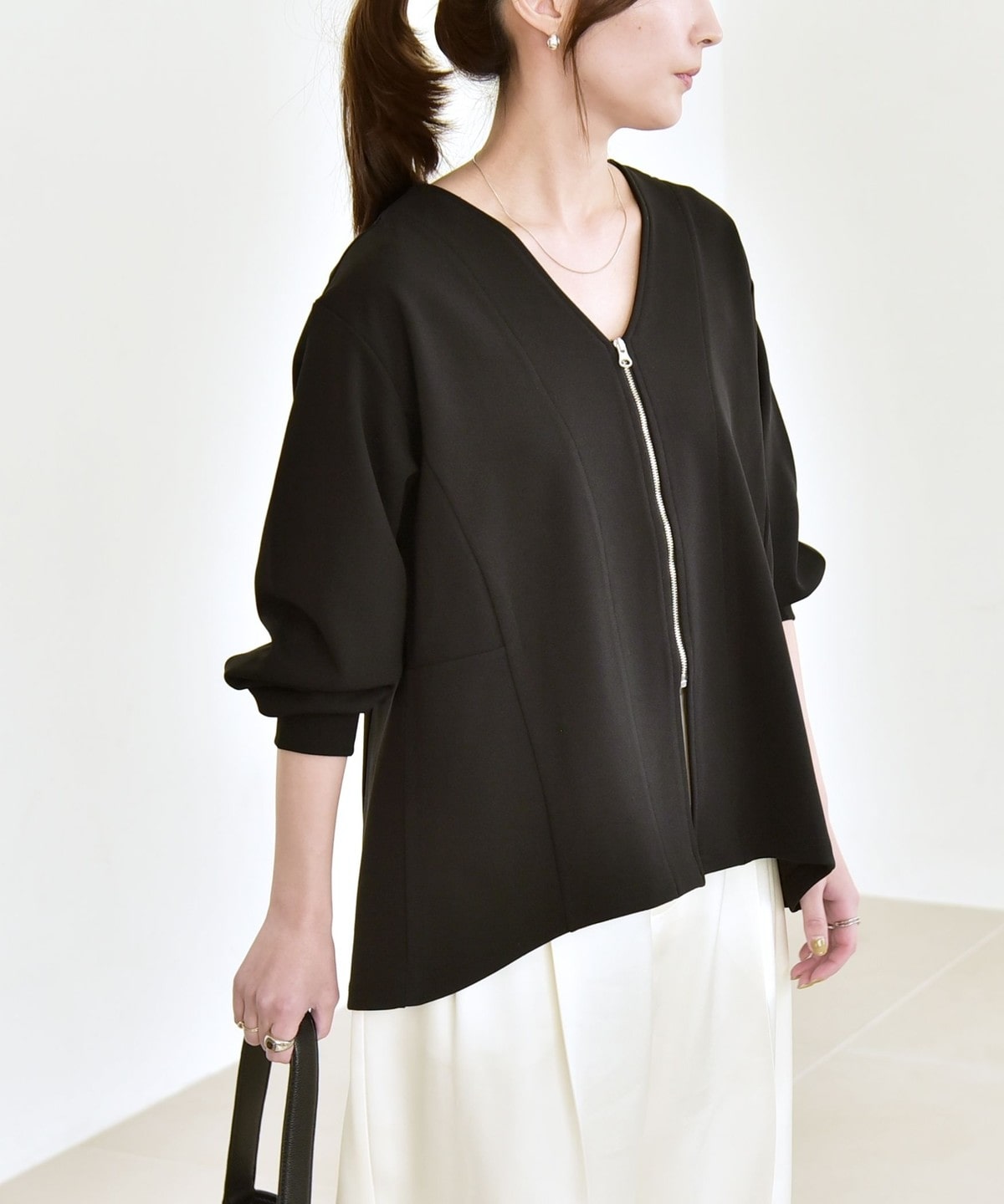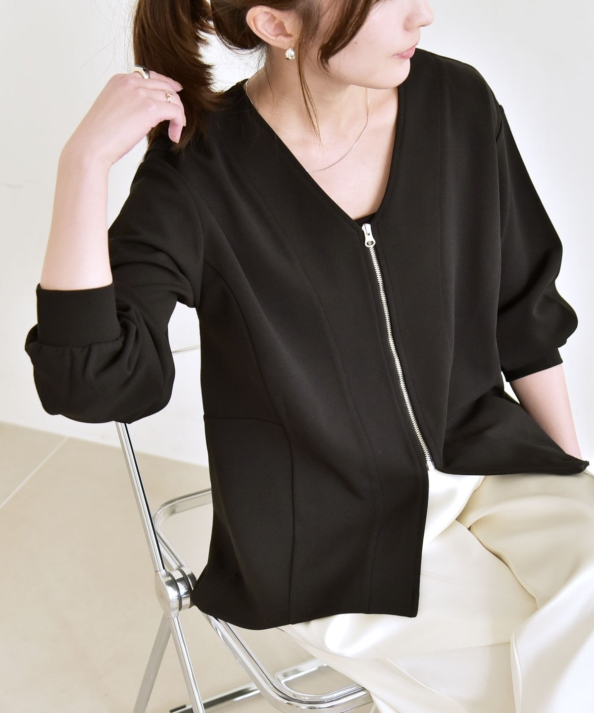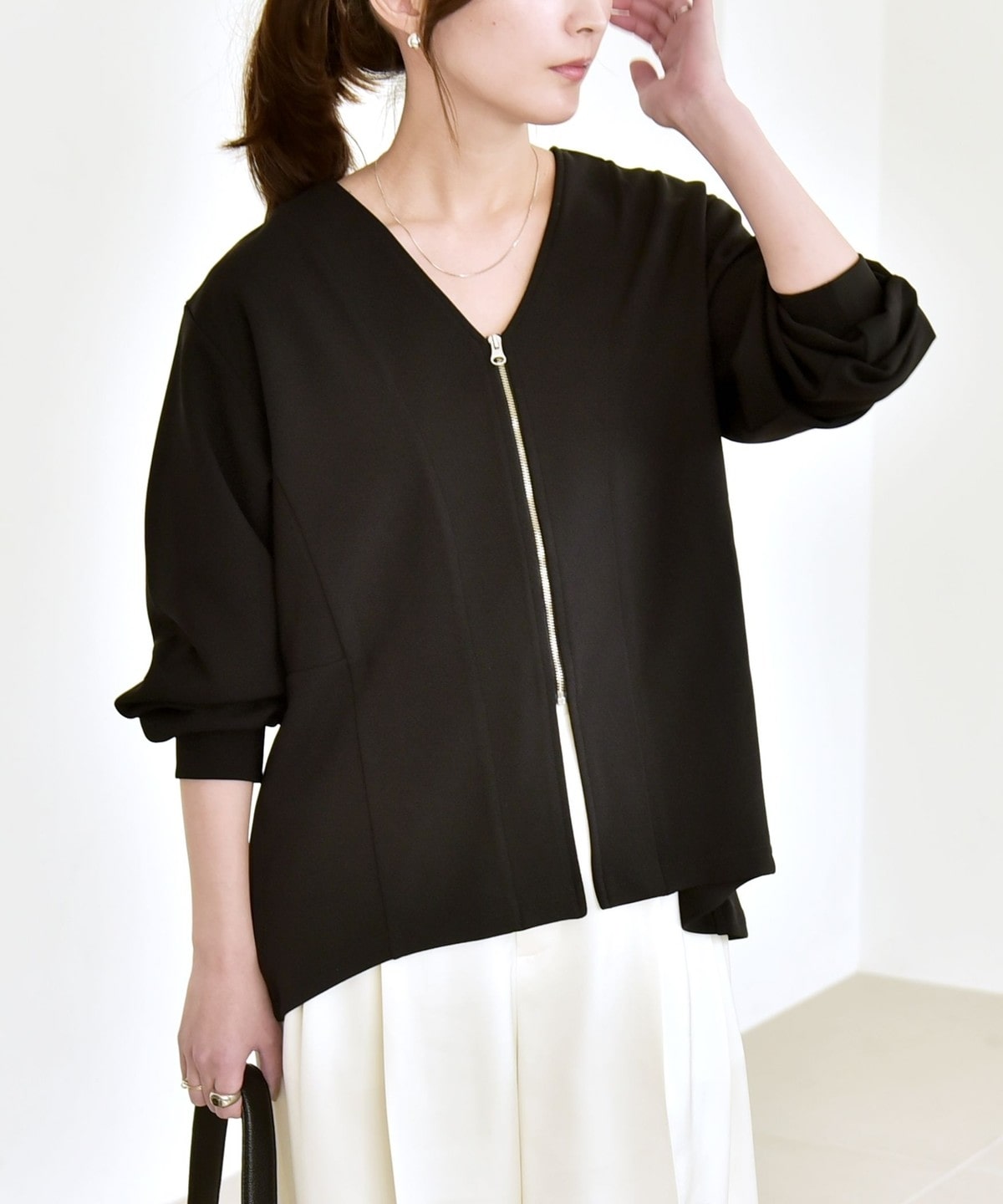 quaranciel:〈洗濯機可能〉カットジョーゼット Vネック ジップ カーディガン