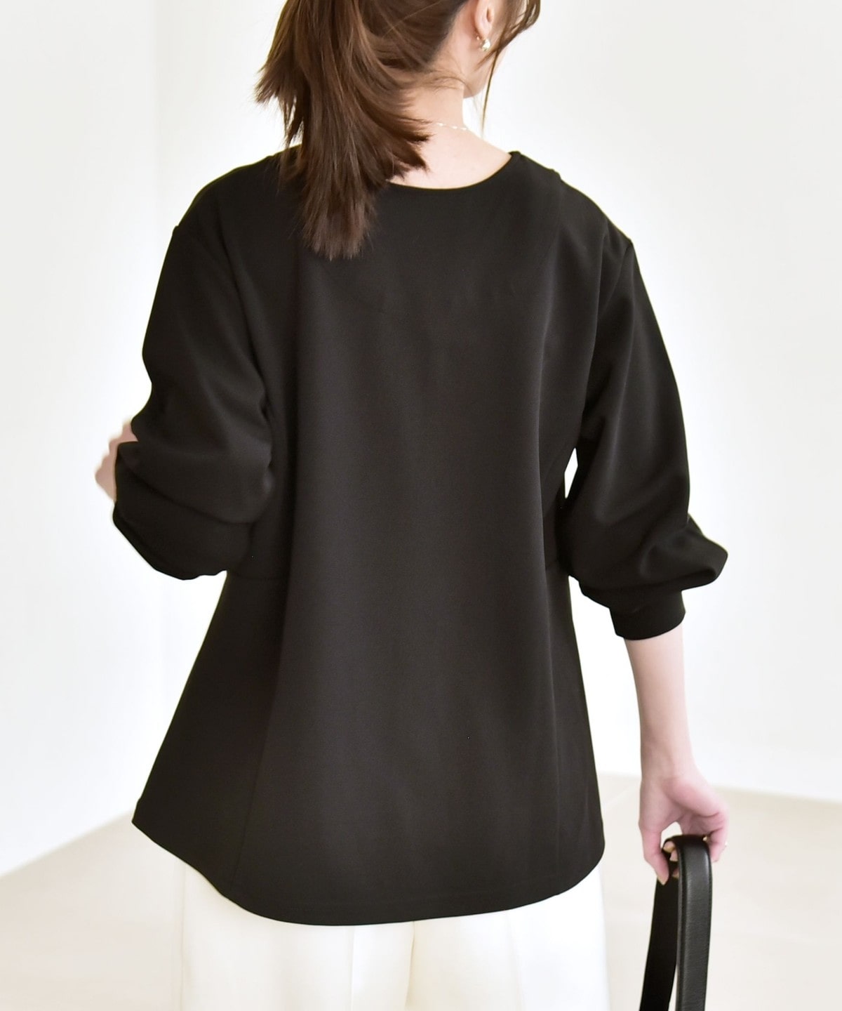 サイズ感:着丈はヒップにかかる丈。袖丈は手の甲にかかるぐらいです。身幅はゆとりがありますが、切り替えにこだわっているので細見えさせてくれます。