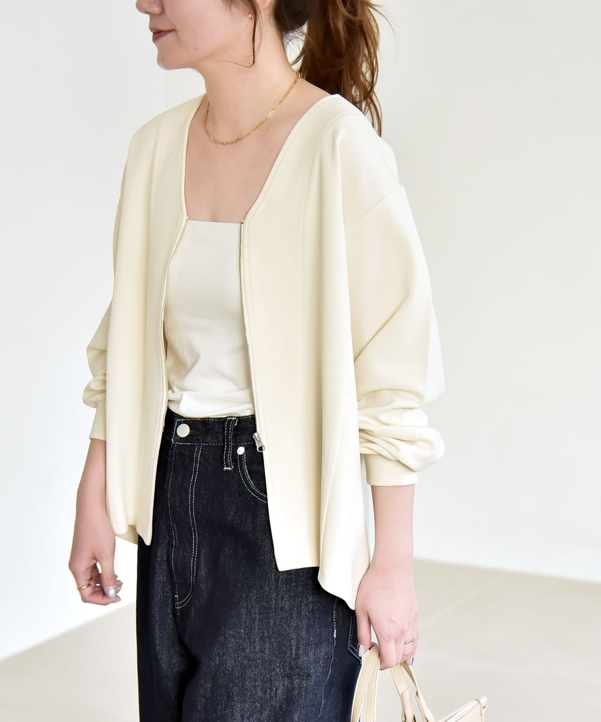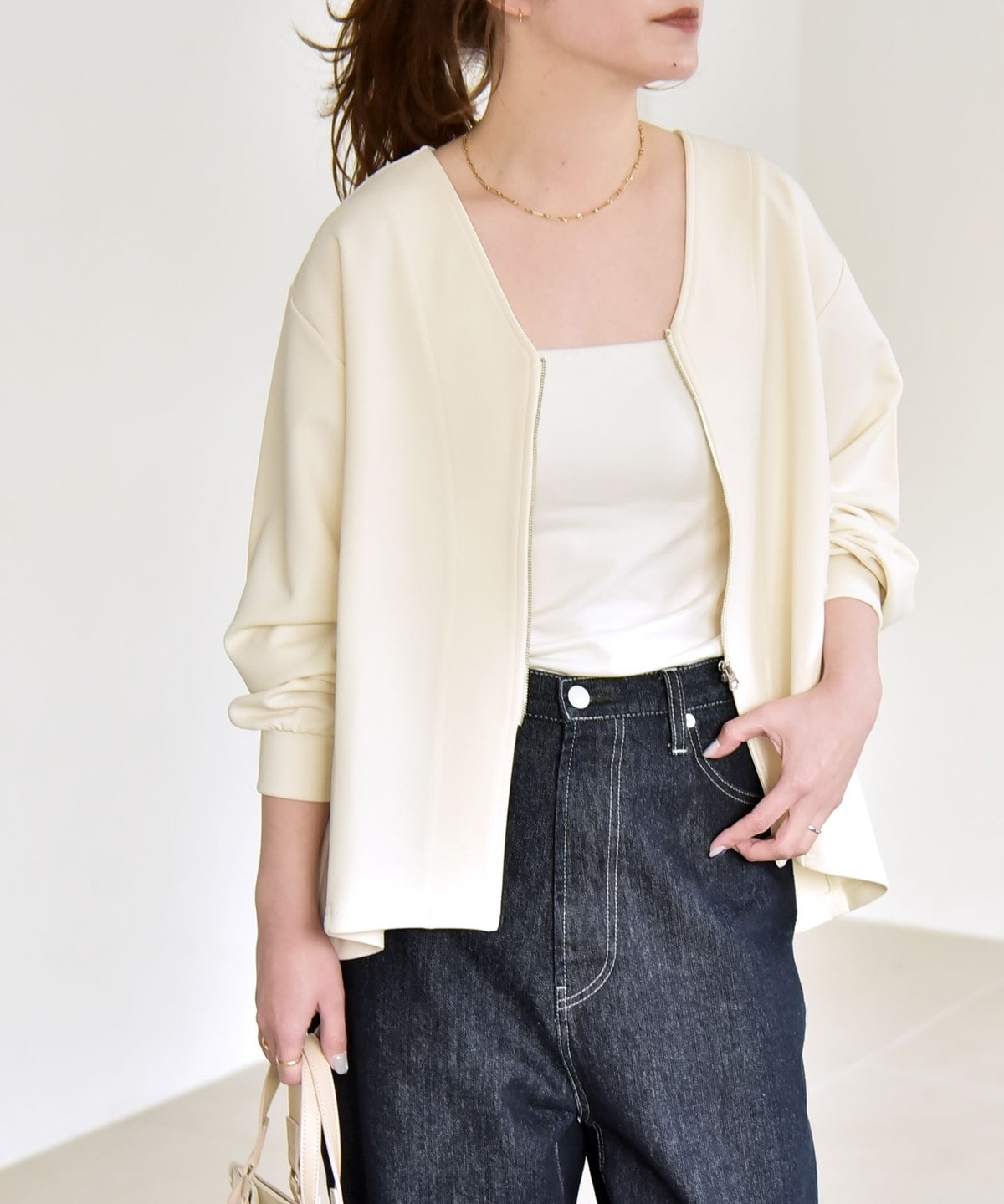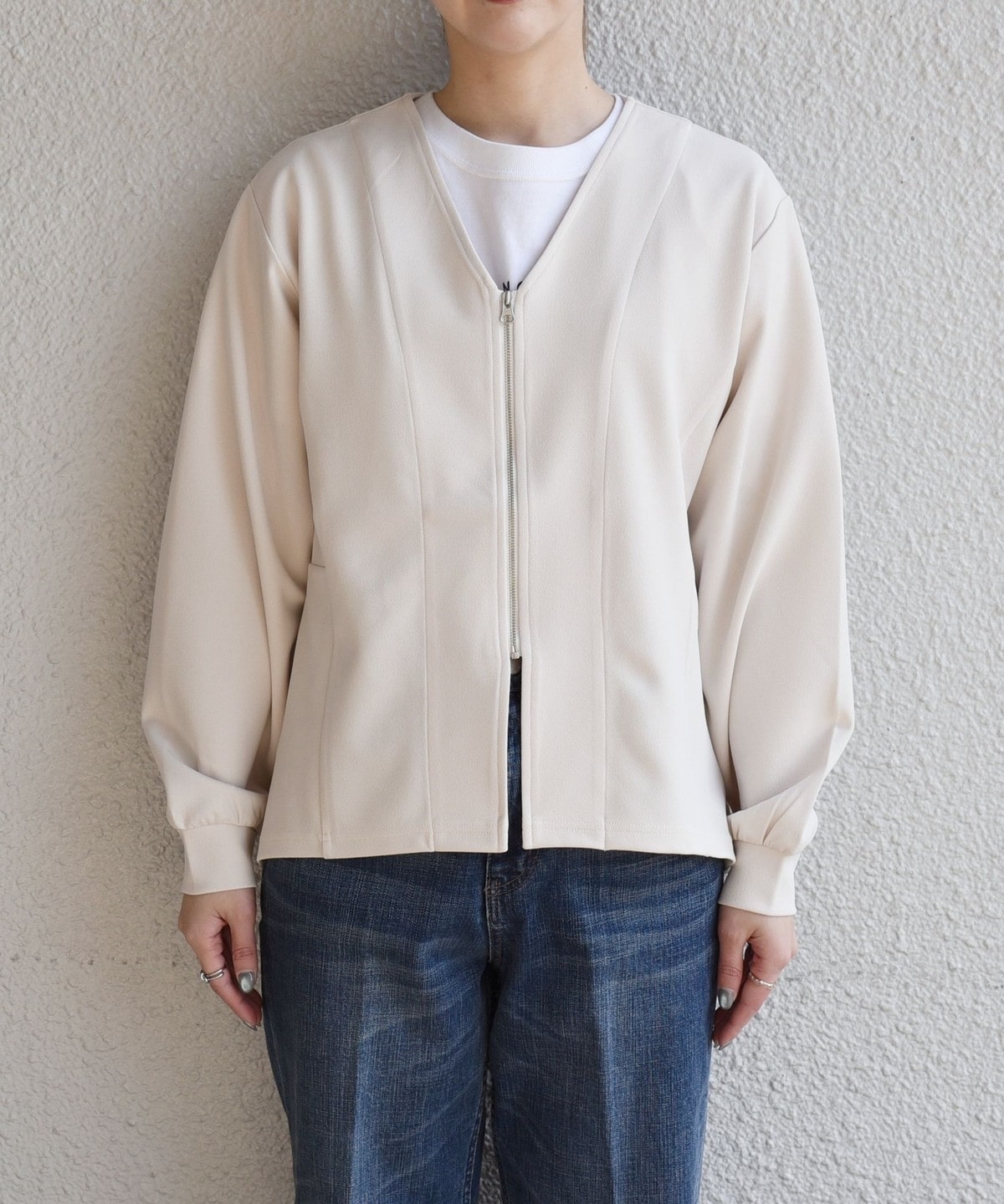 伸縮性があり着心地の良いジャージー素材のジップカーディガン。