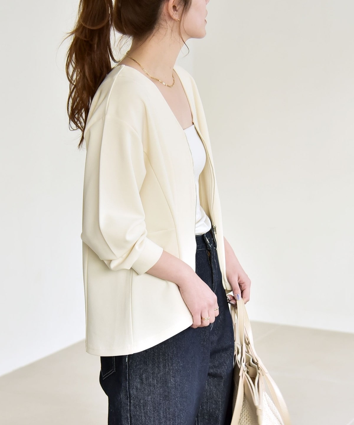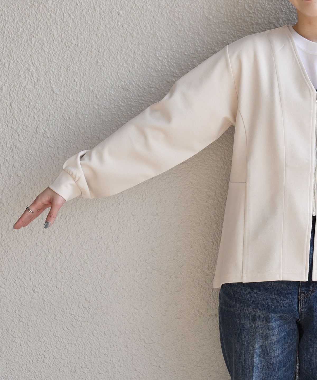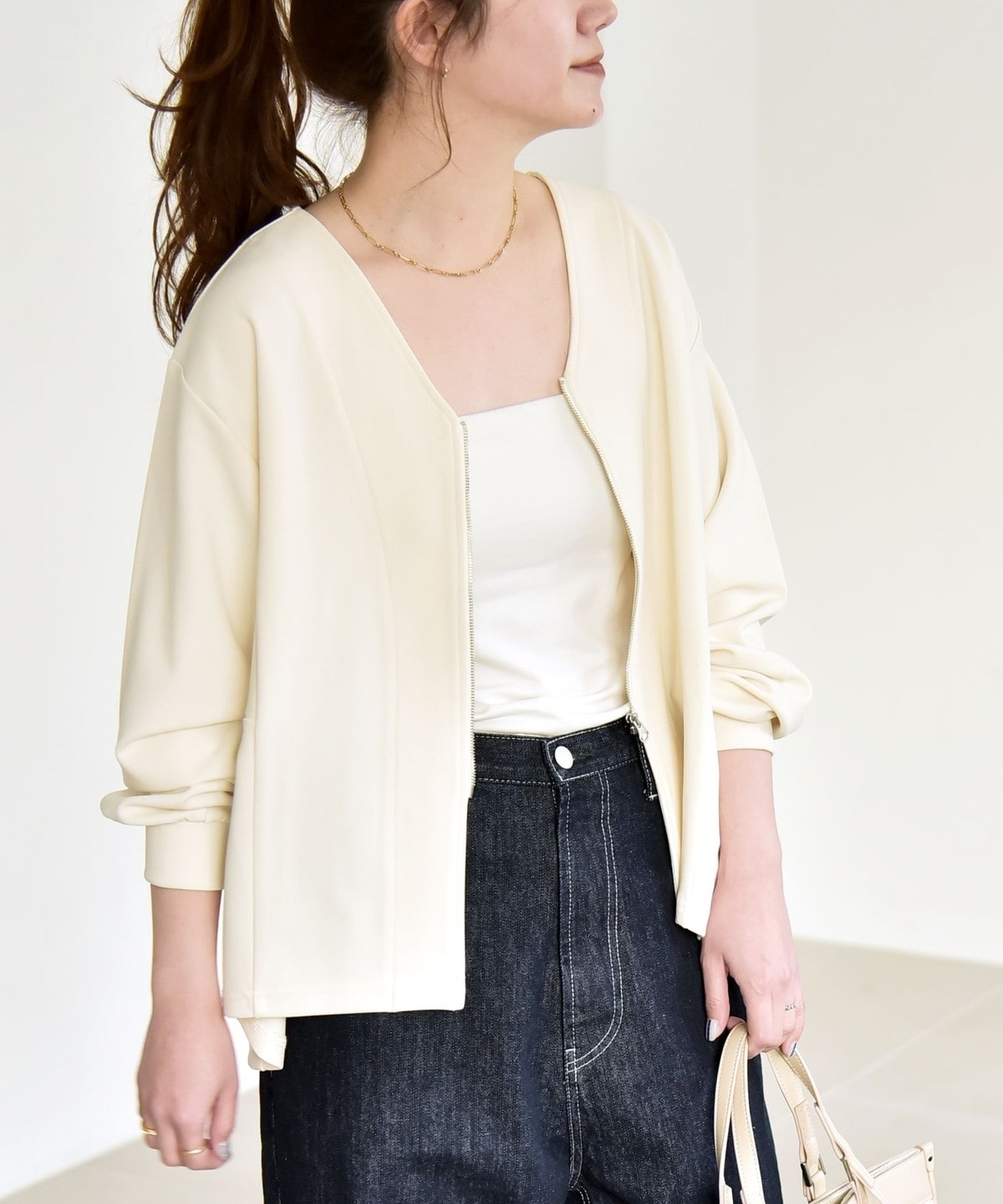 伸縮性があり着心地の良いジャージー素材のジップカーディガン。