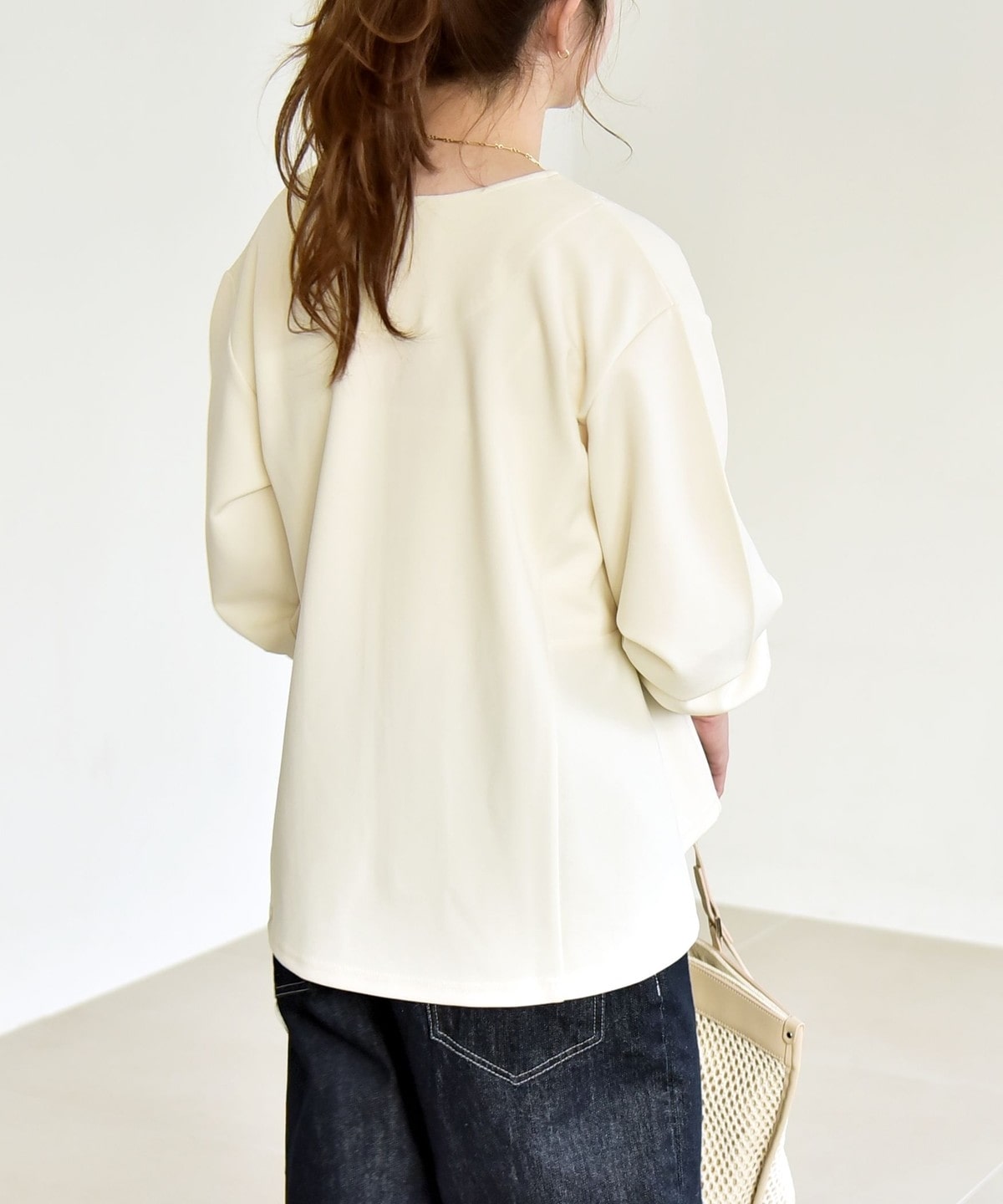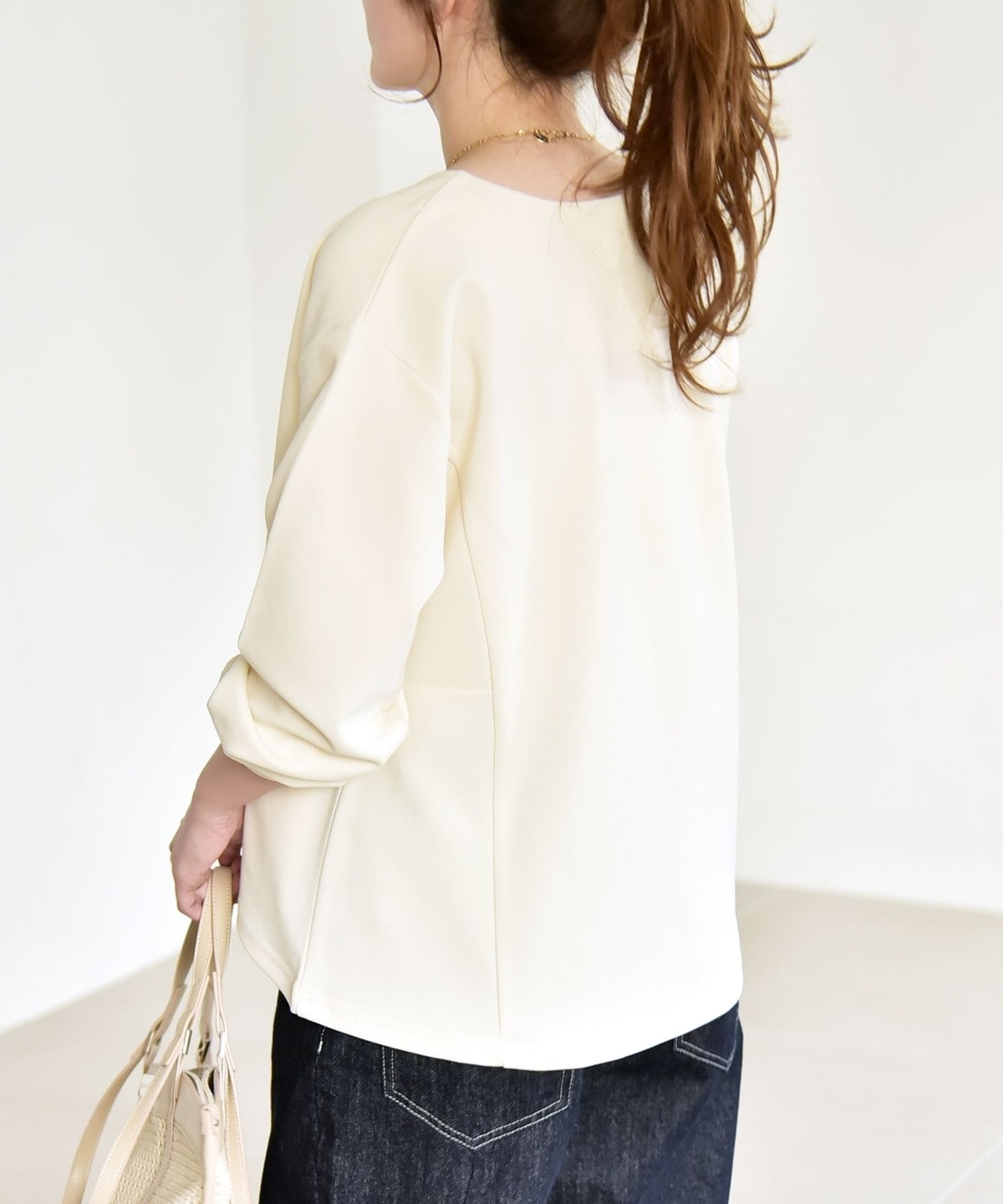 首元はざっくりと開いたVネックで、デコルテや顔周りをすっきりと華奢見せさせてくれます。