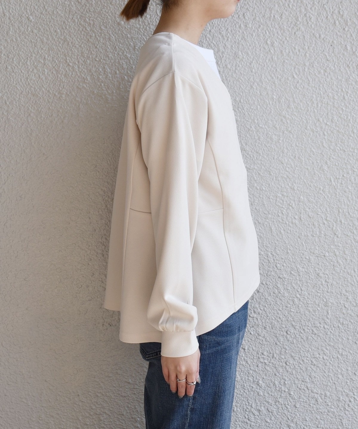 通勤やオフィスカジュアルスタイルでは、ブラウスやリブニットの上にジャケット感覚で着ても◎
