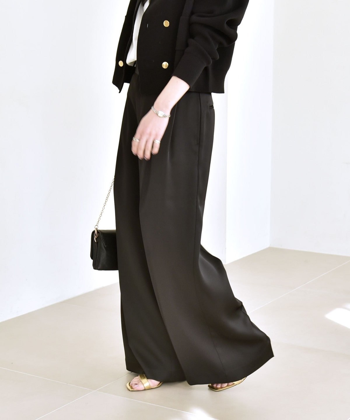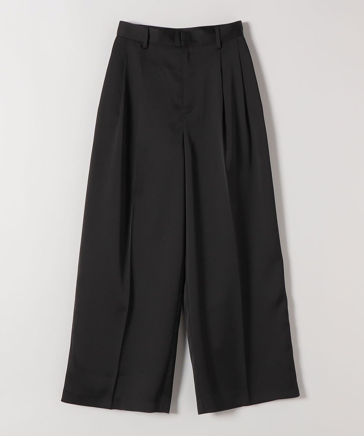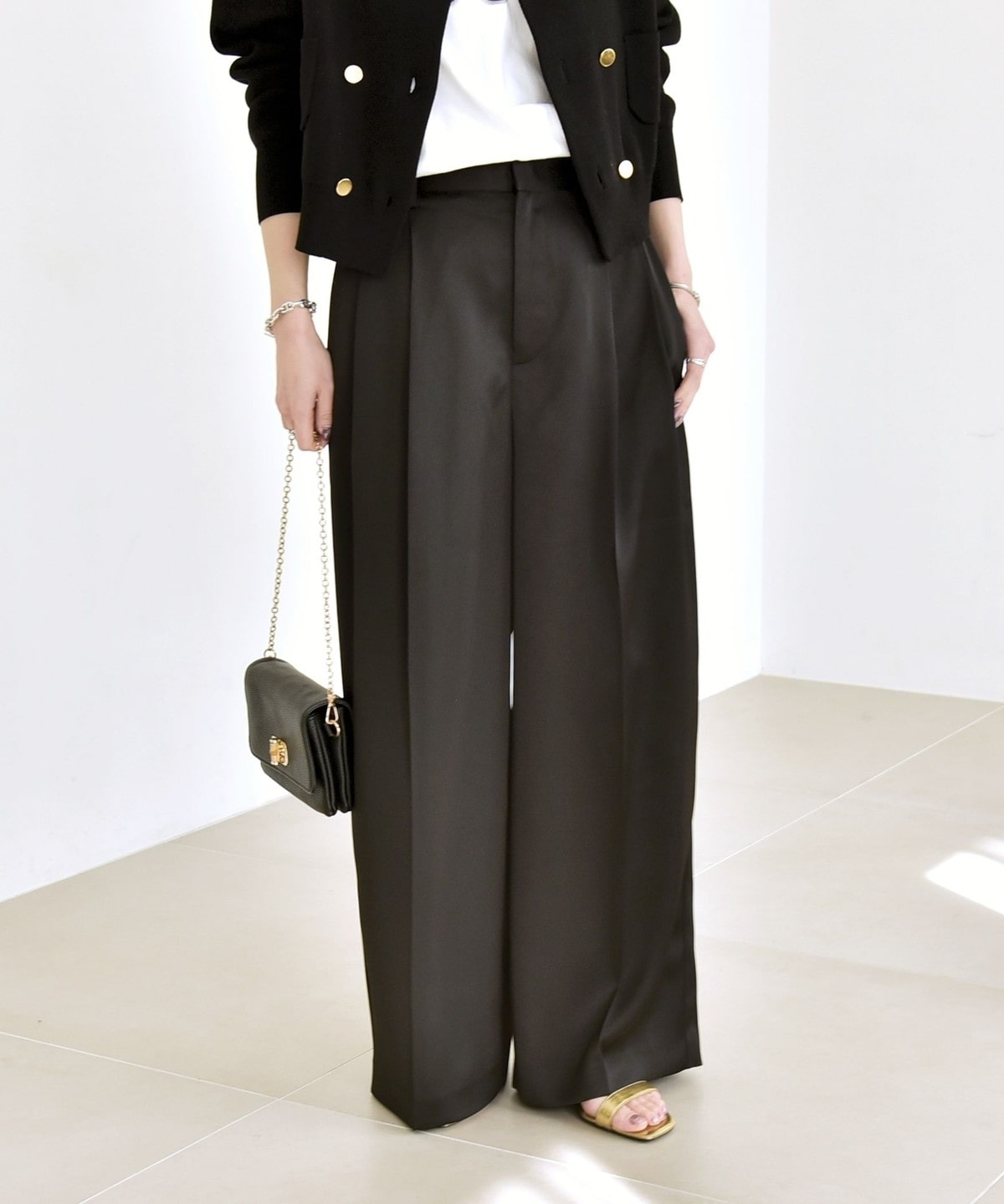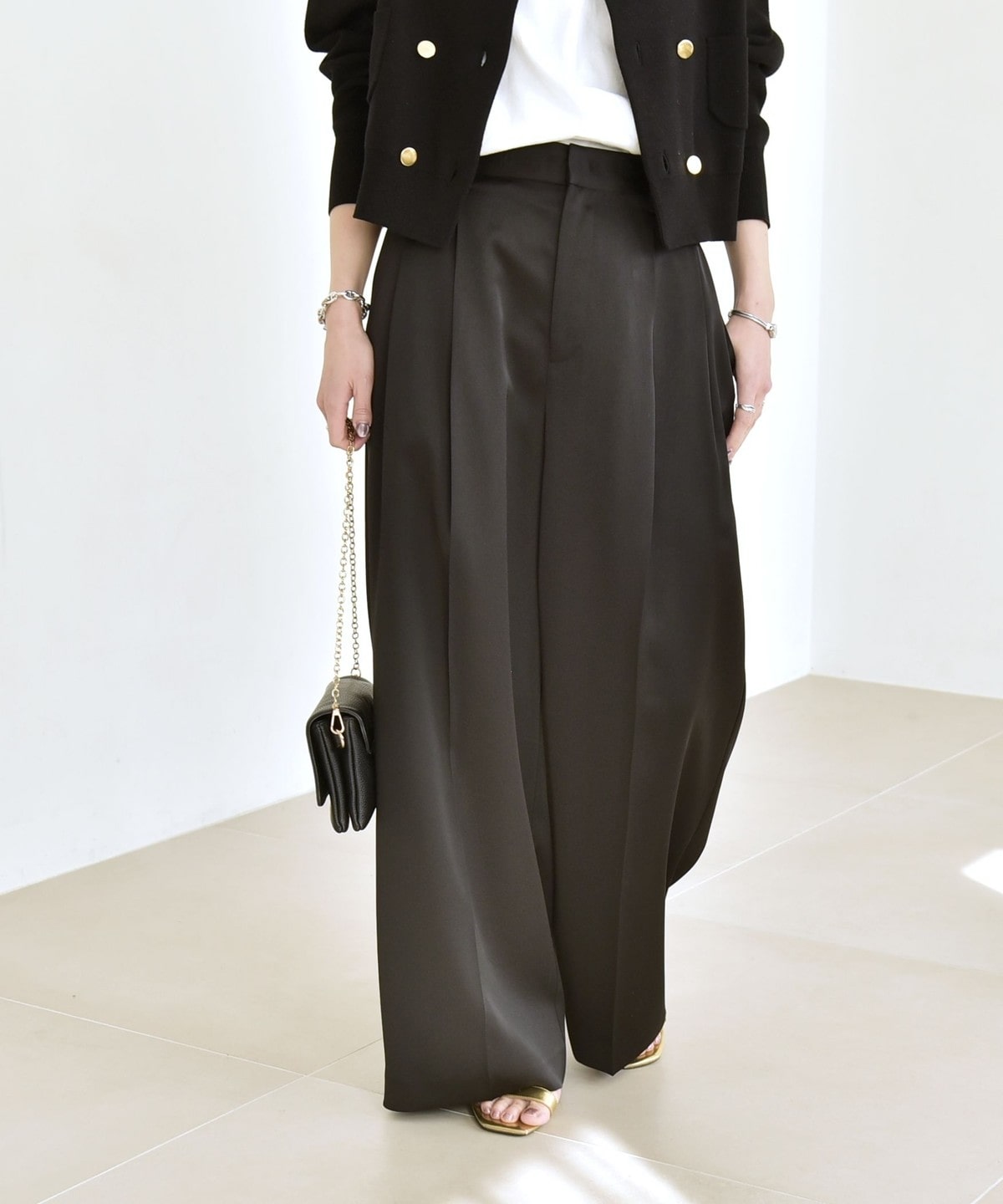 落ち感のあるサテン素材と、ワイドストレートシルエットが綺麗なハイウエストパンツ。
