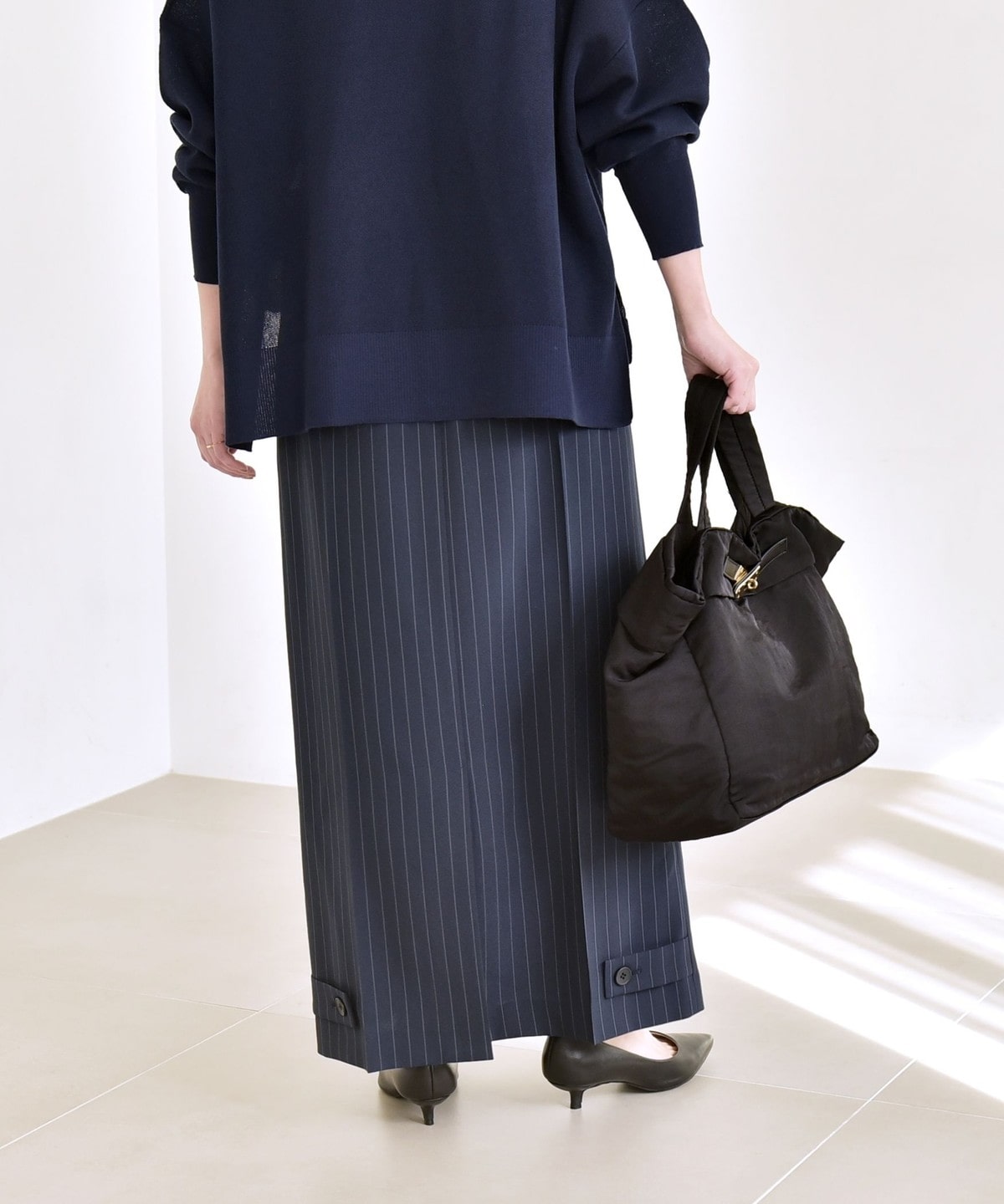 ヒールパンプスで女性らしく、ローファーでモードな雰囲気にまとめても◎