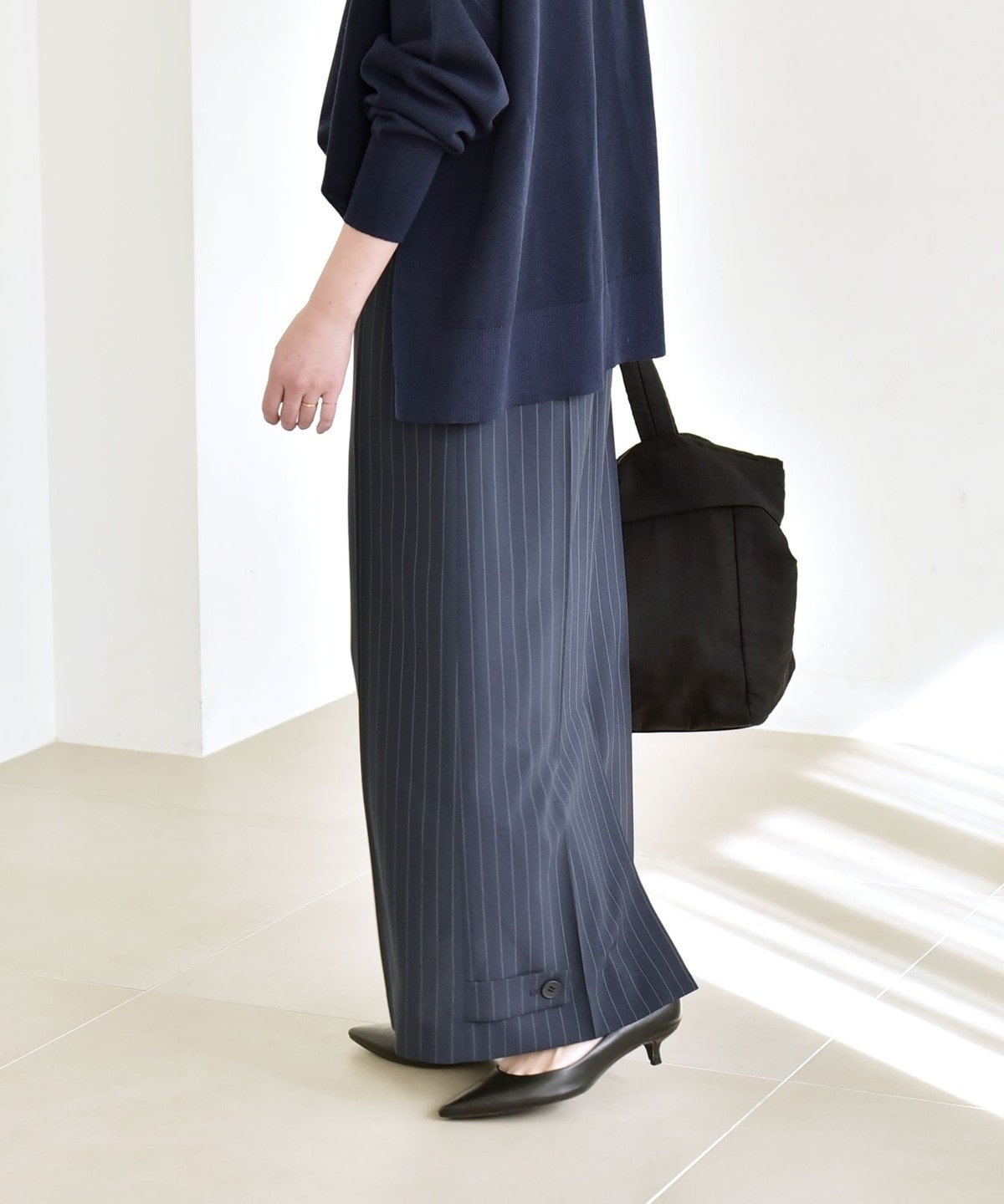 サイズ感:ウエストはタックインしても余裕があります。くるぶし丈なので、フラットシューズでも問題なく合わせられます。