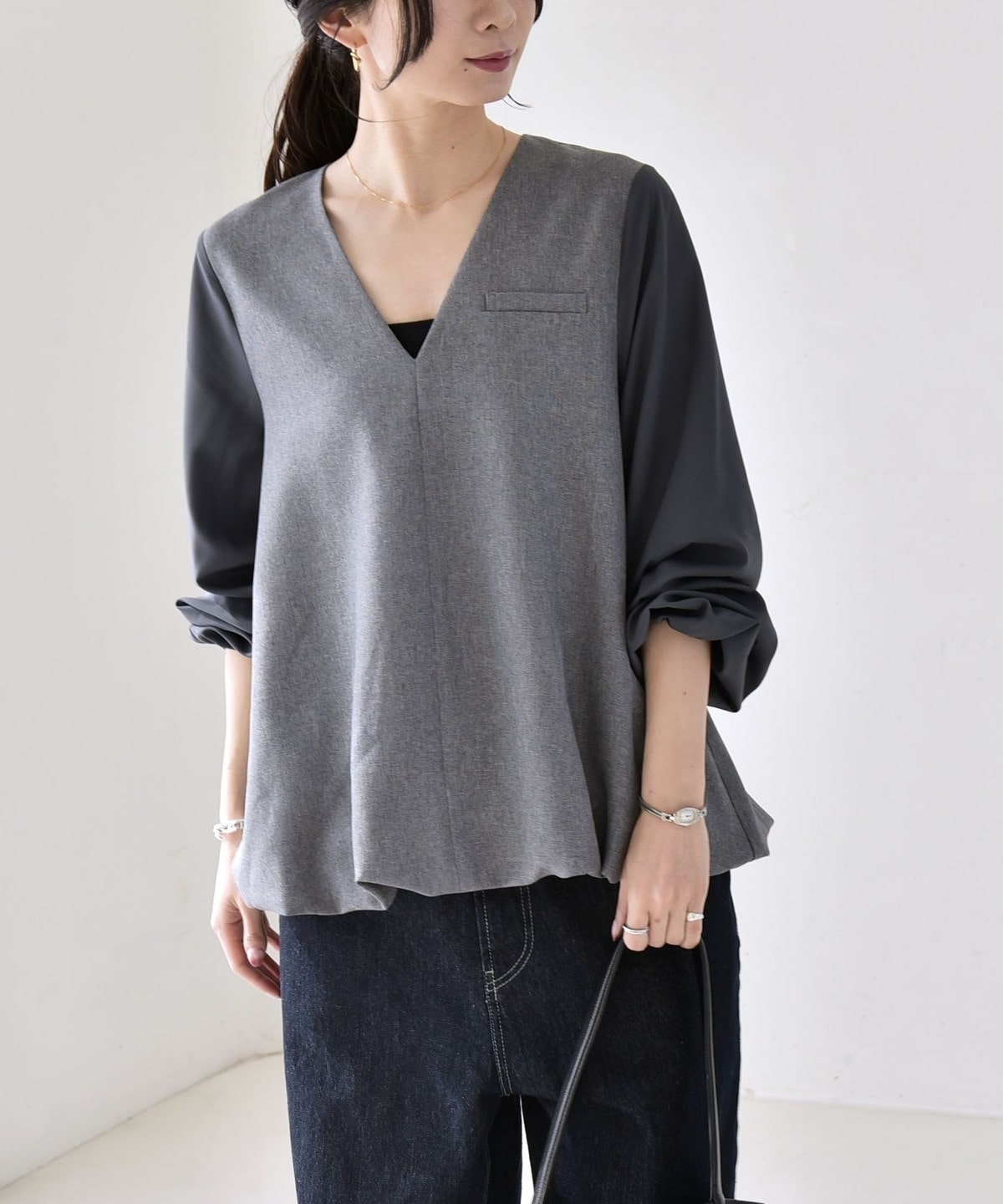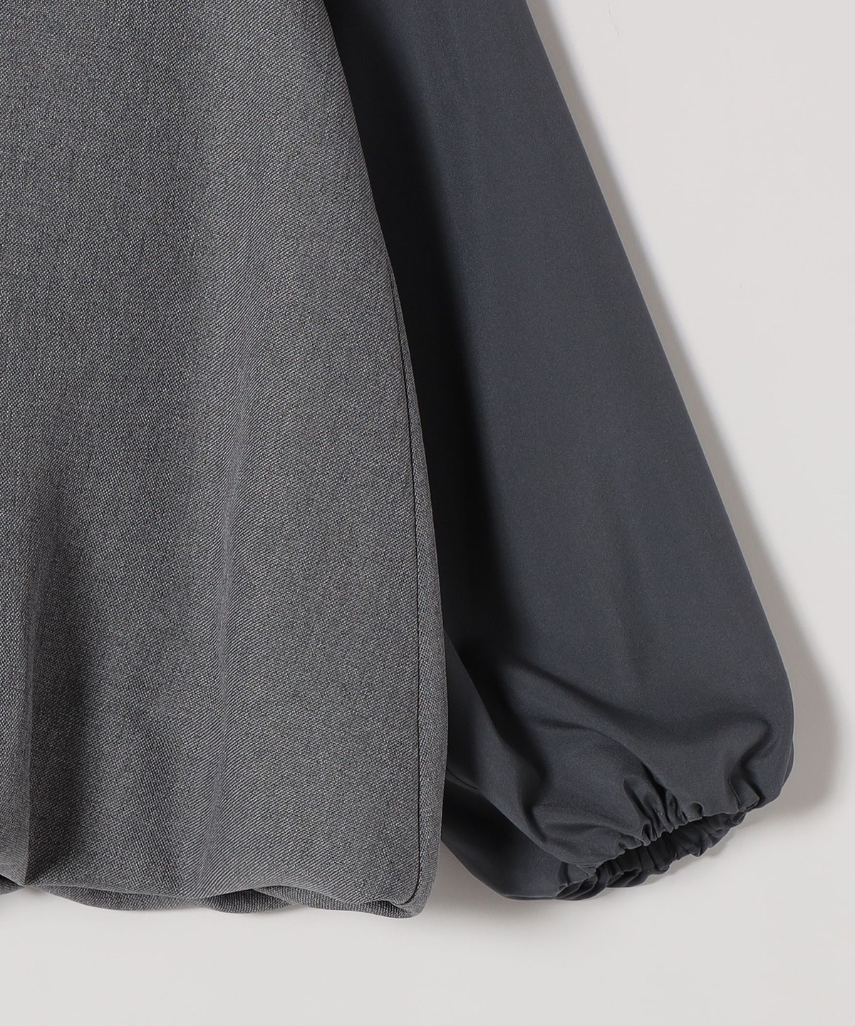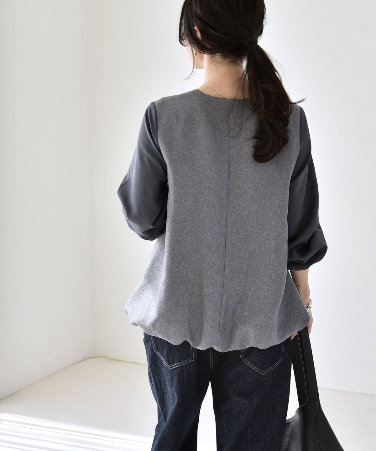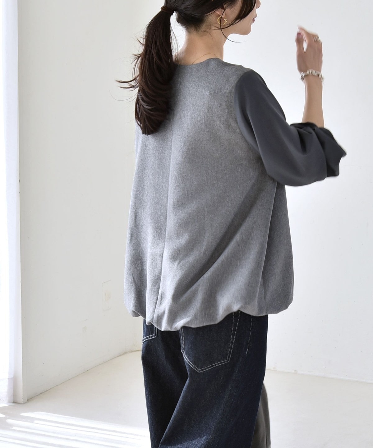 異素材切り替えの袖は、袖口にゴムを施し、きゅっと捲ってパフスリーブのようにボリューム感を出して着こなせます。