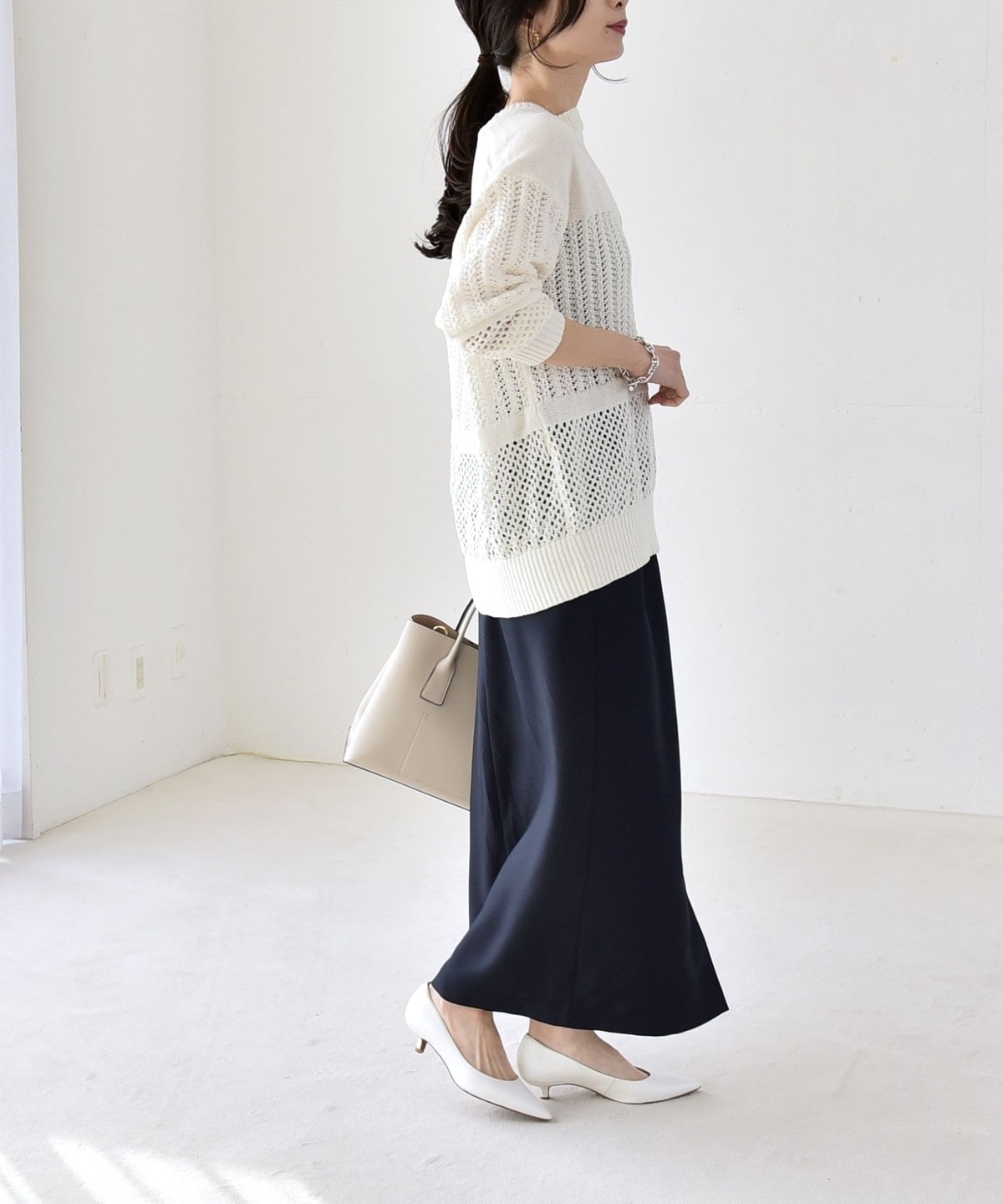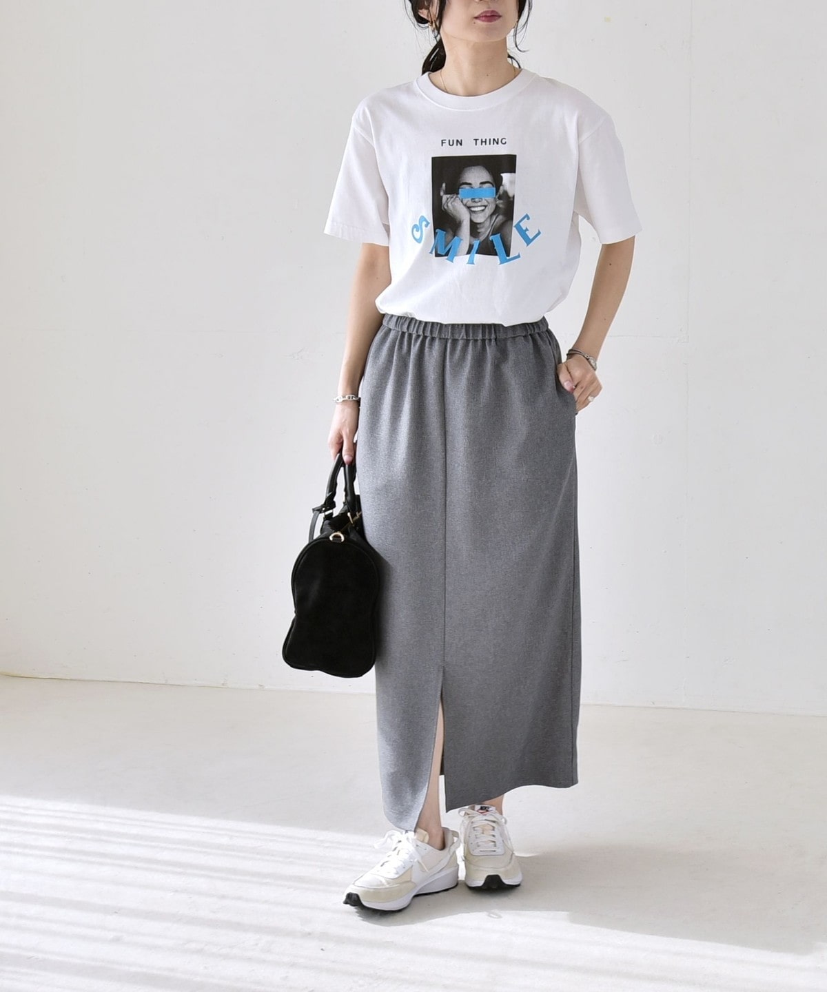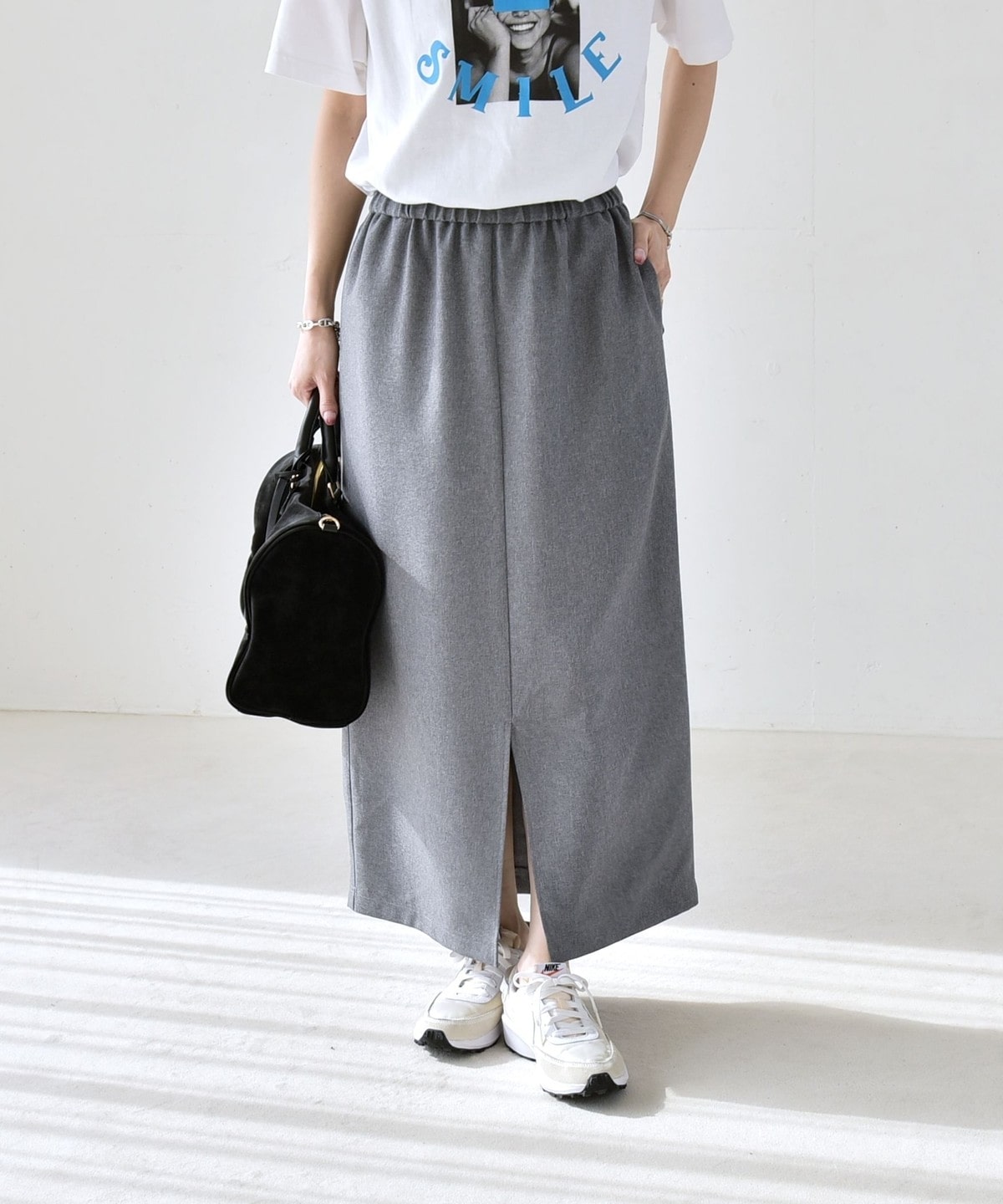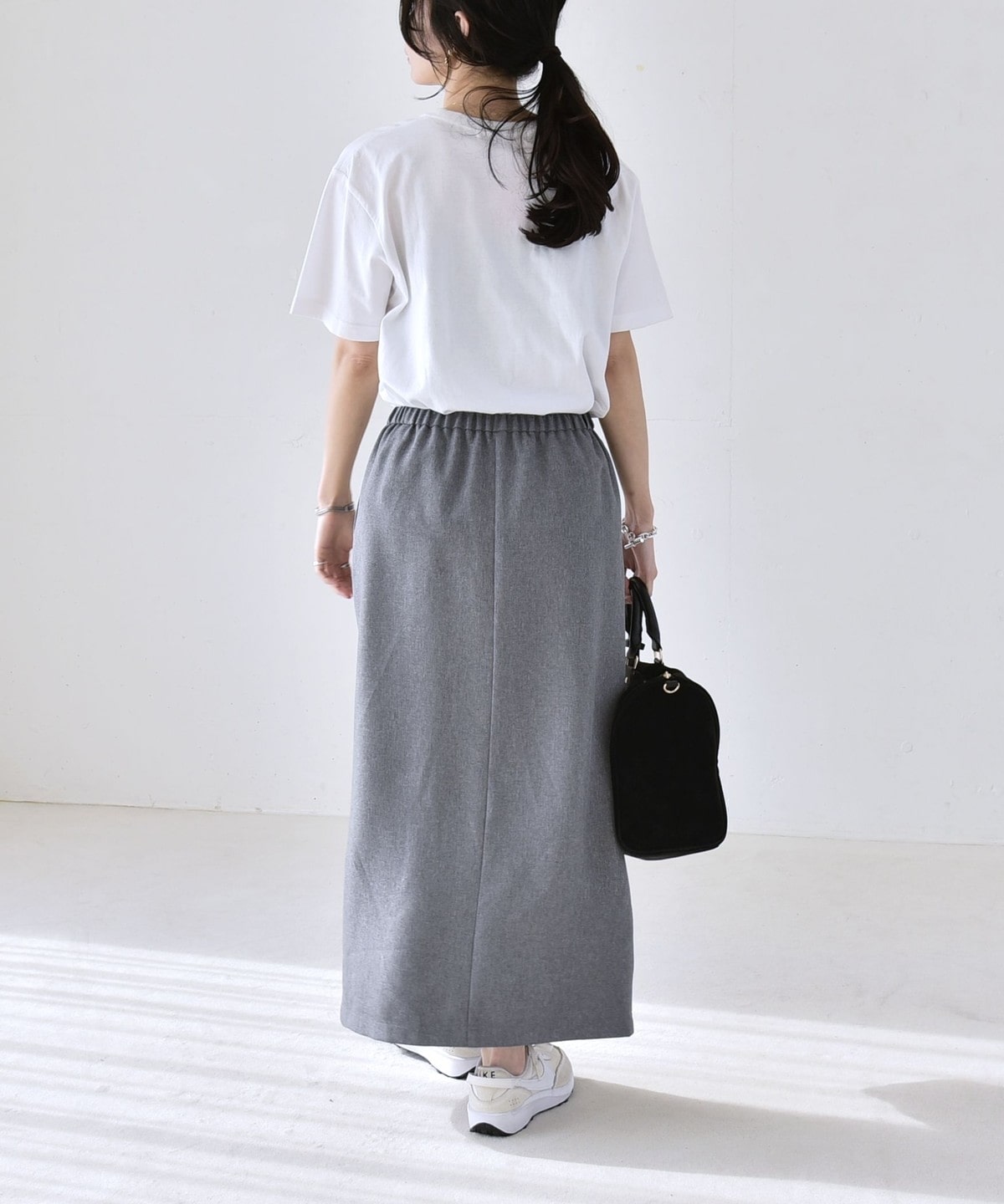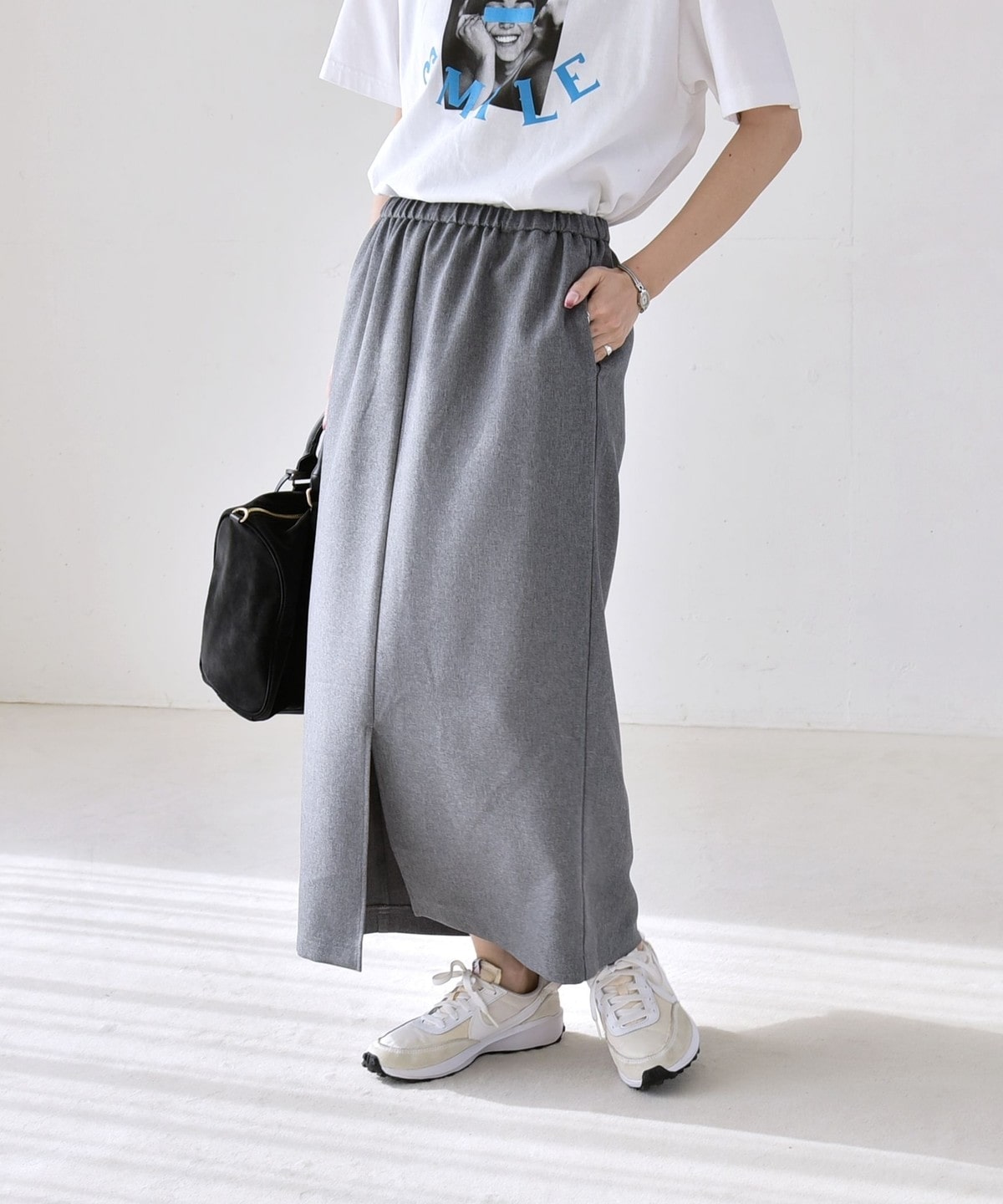 スカートは、ミニマルなデザインで、すとんと落ちるストレートシルエットがポイント。