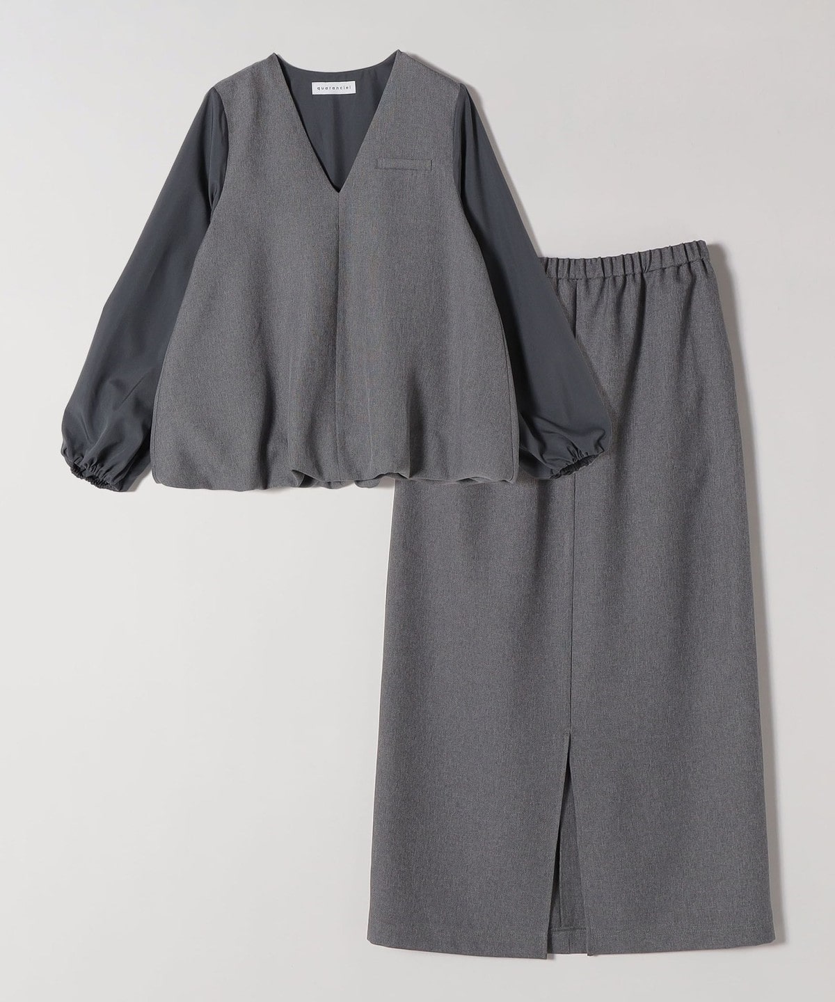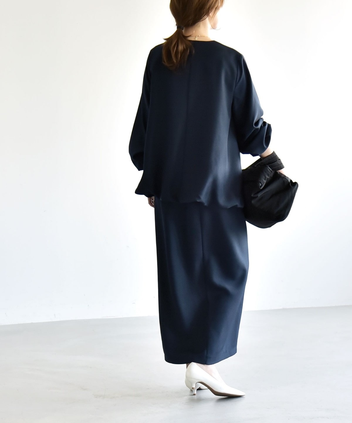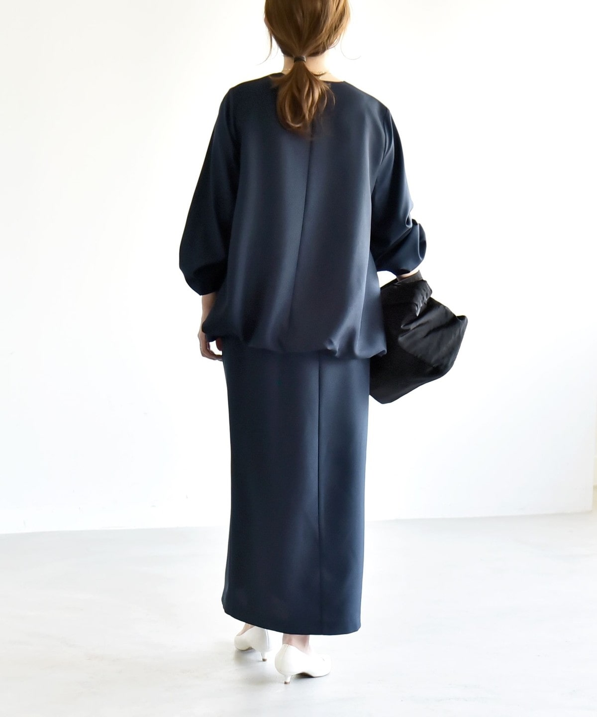 袖の異素材ドッキングデザインがポイントのブラウスと、Iラインスカートのセットアイテム。