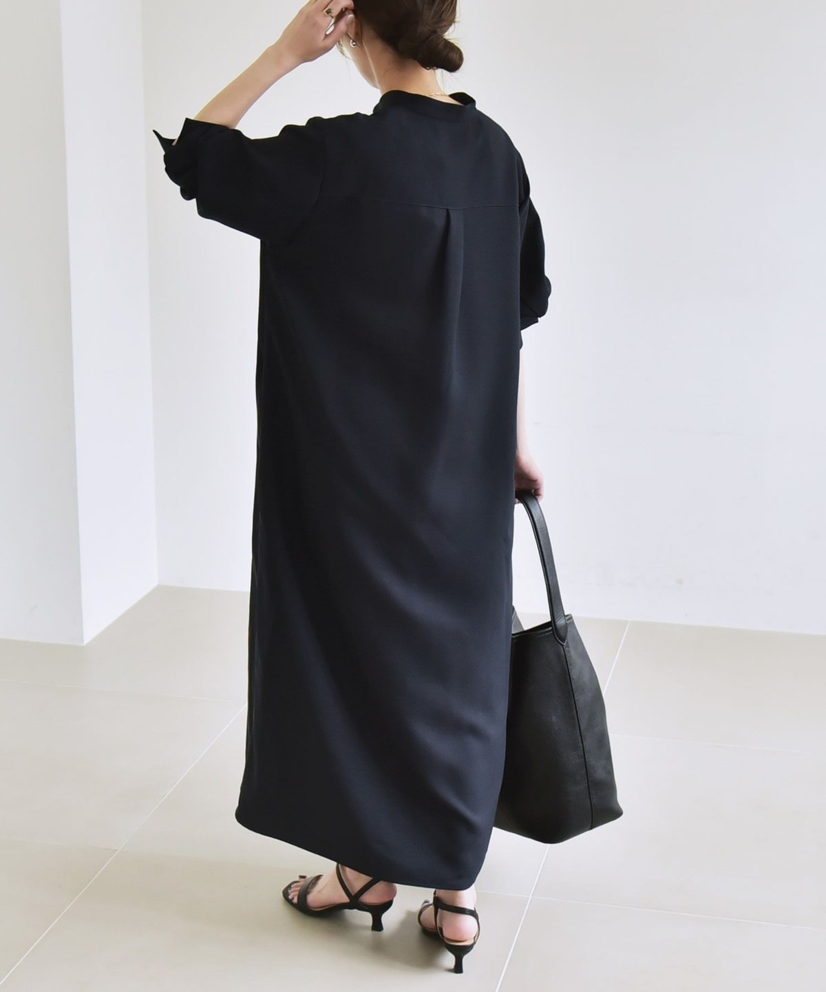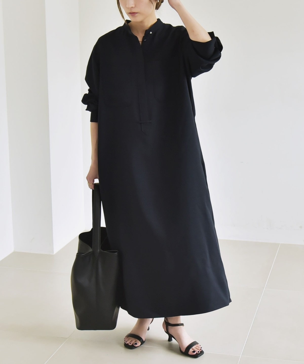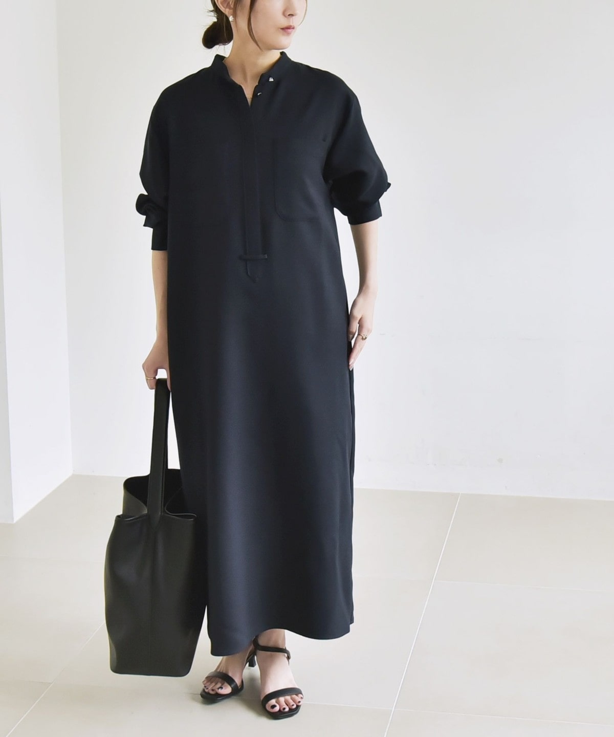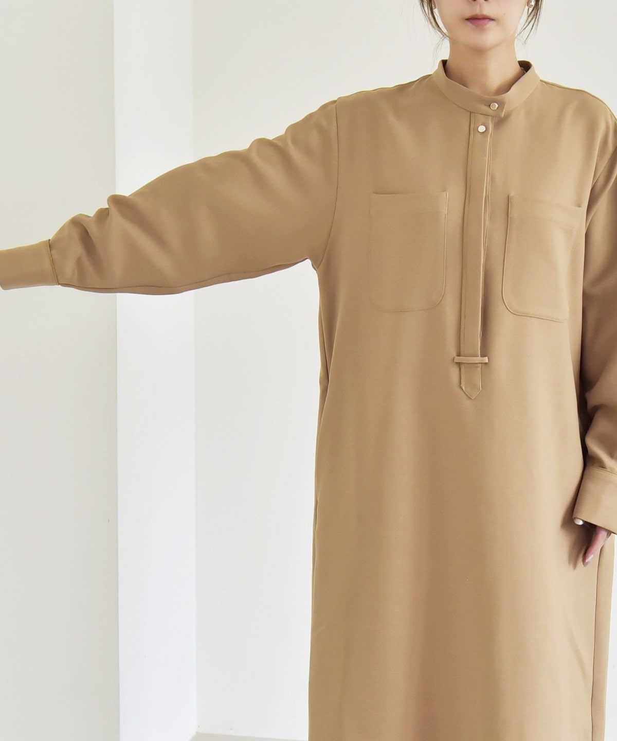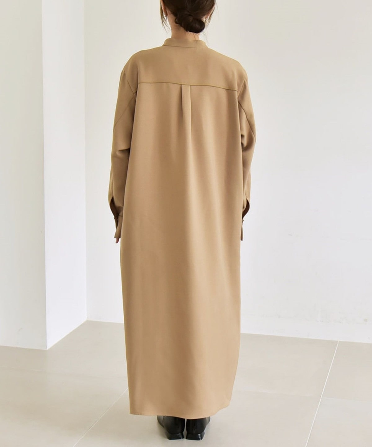 ミニマルな縦長シルエットに、スタンドカラーが目を惹くシャツワンピース。