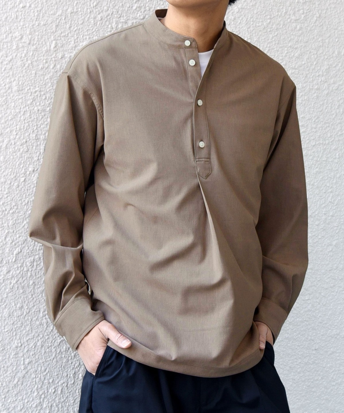 今期は人気のタック入りバンドカラープルオーバーシャツの裾をスピンドル仕様へとブラッシュアップ!