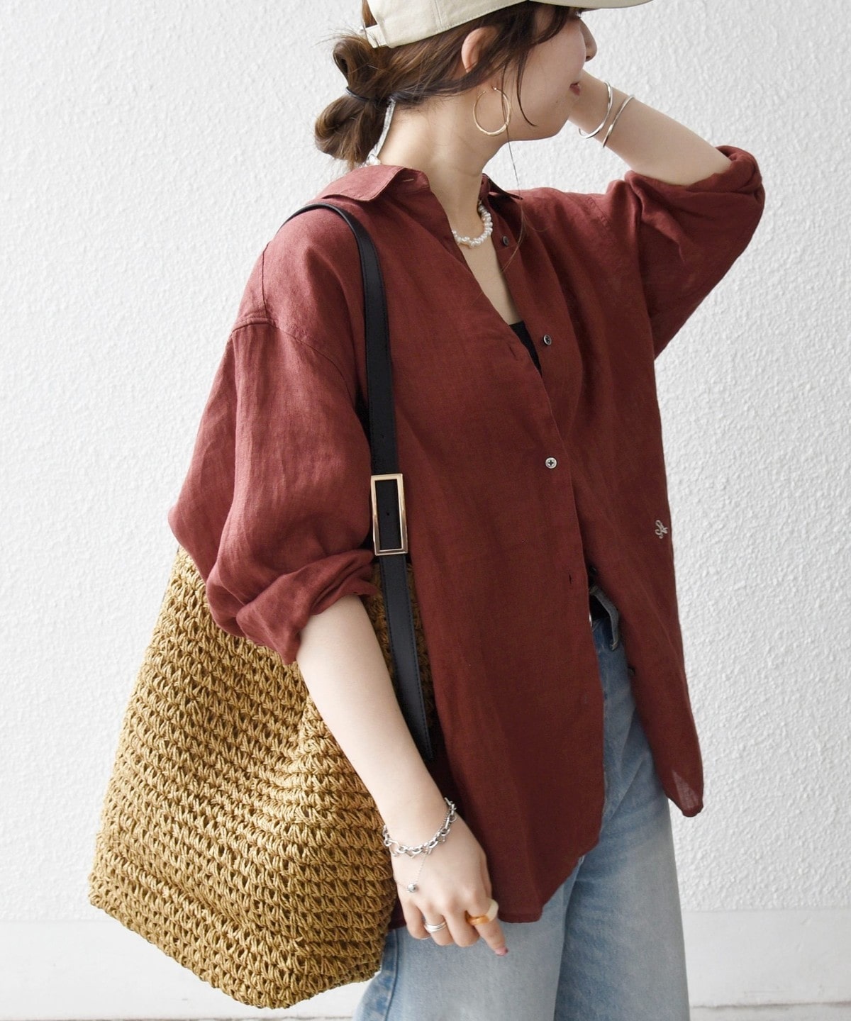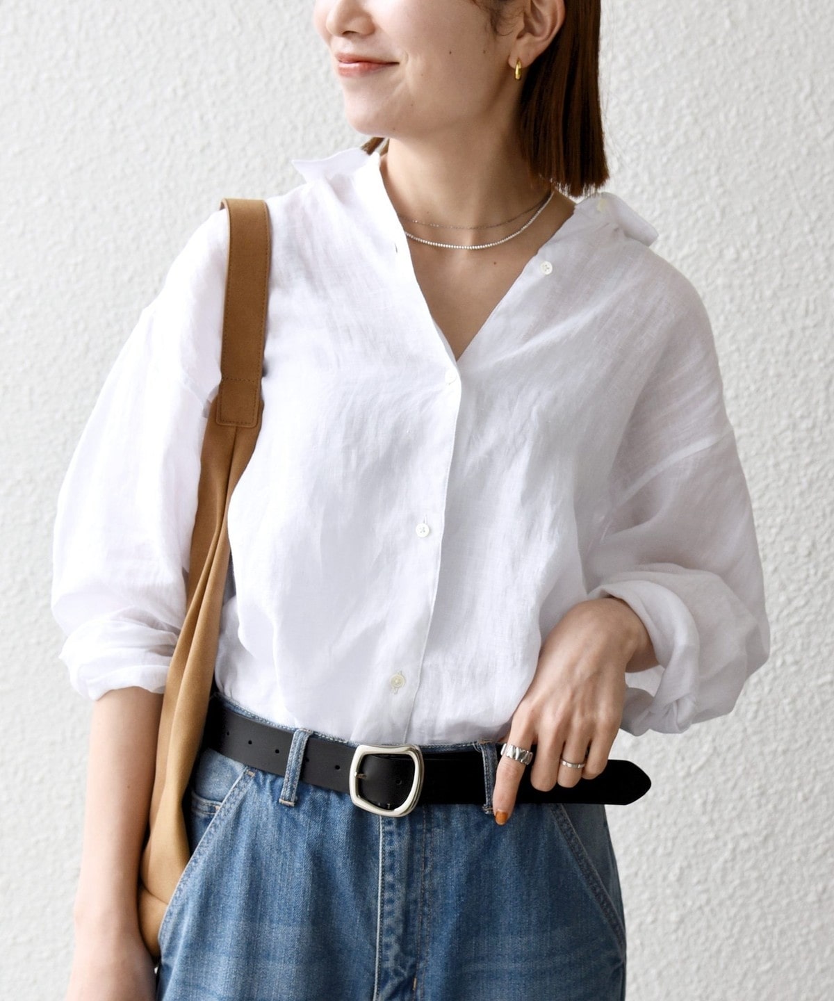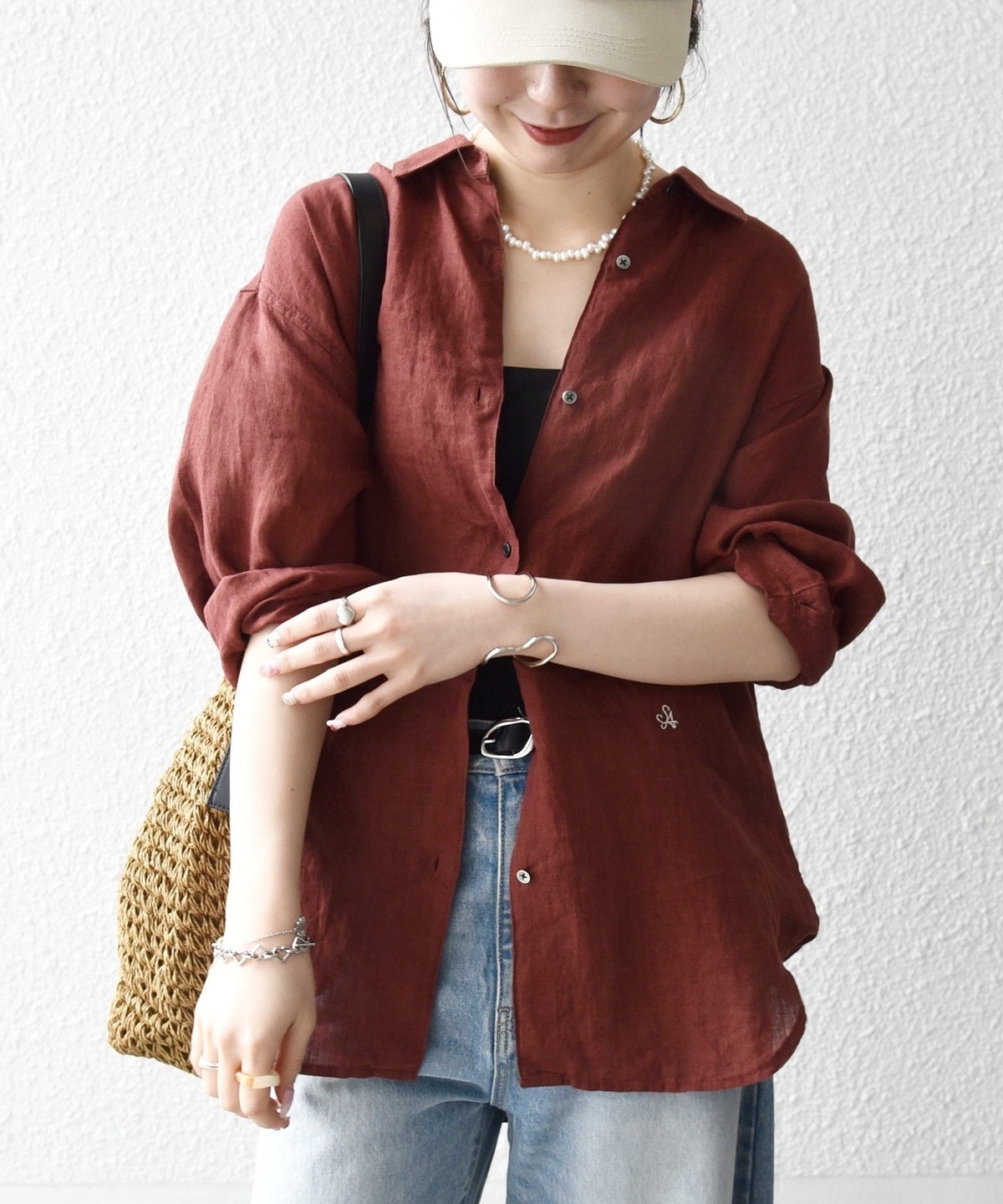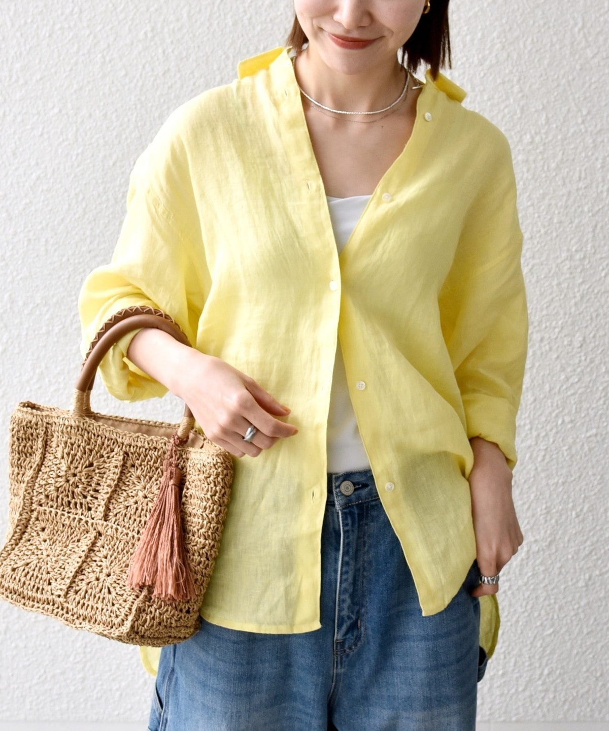 程良いリネンのシアー感があるので、キャミやタンクにさらっと重ねてヘルシーな着こなしがおすすめ。