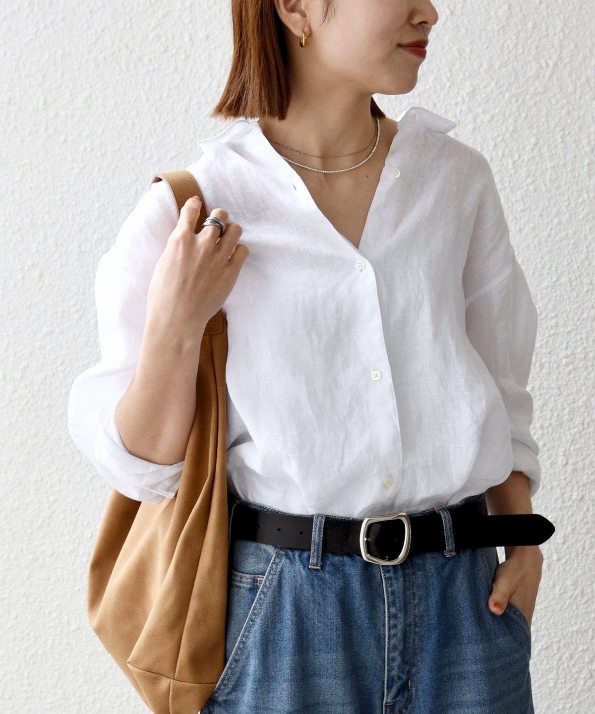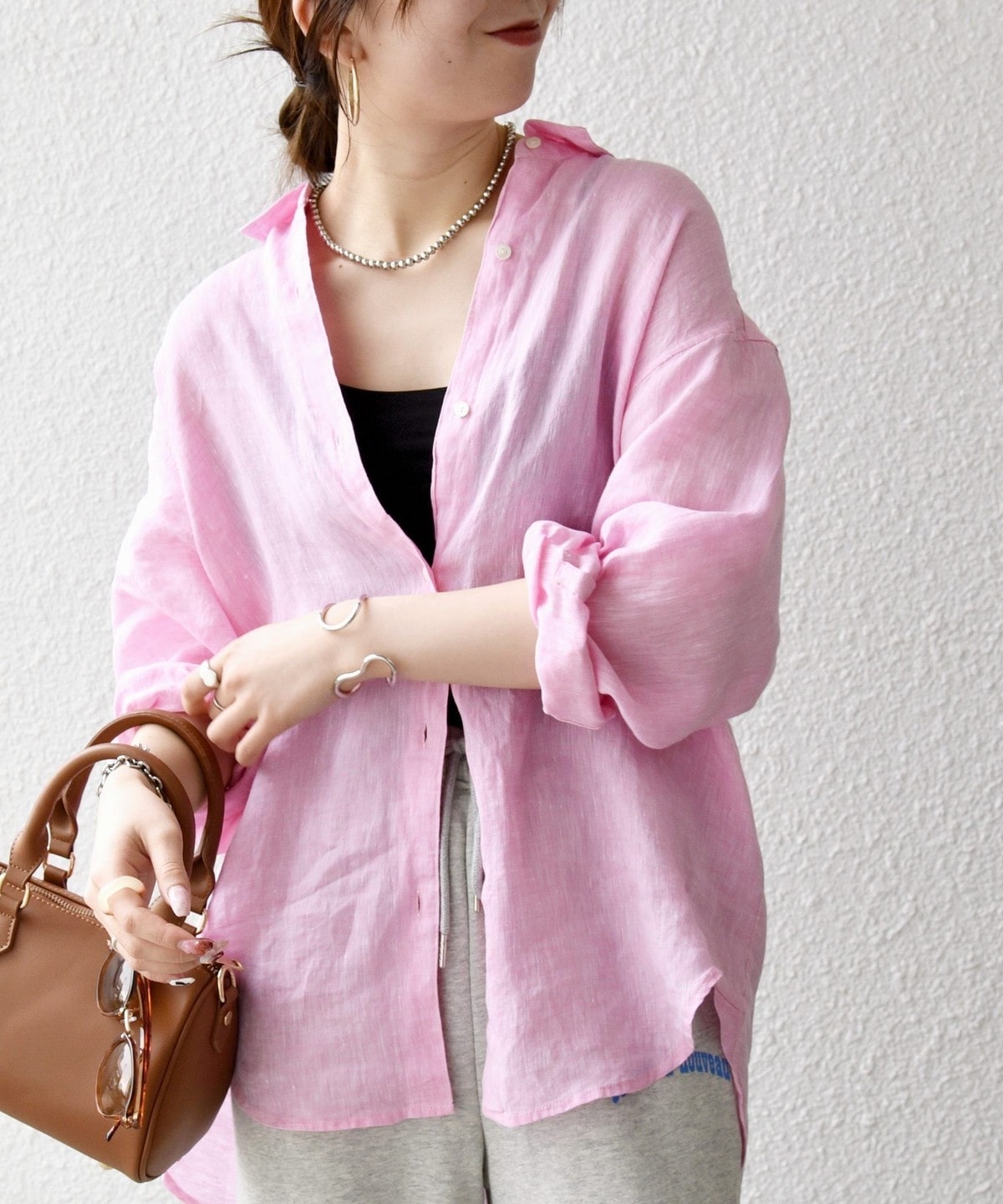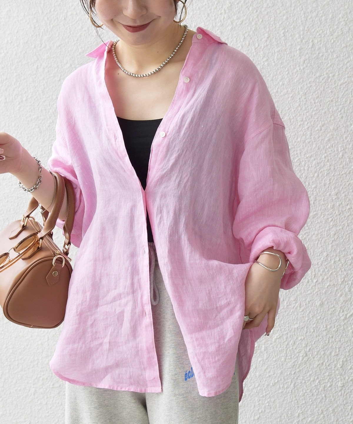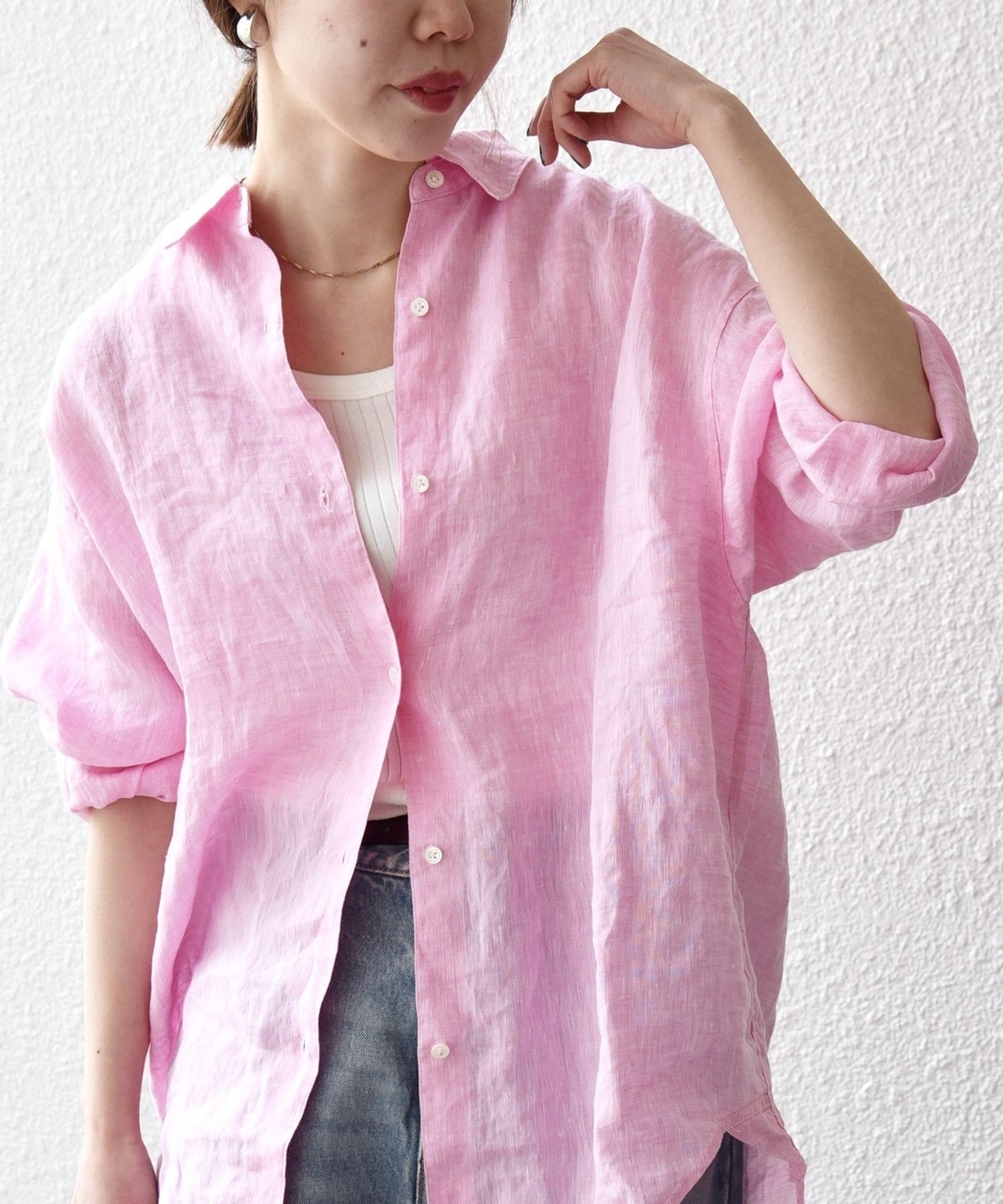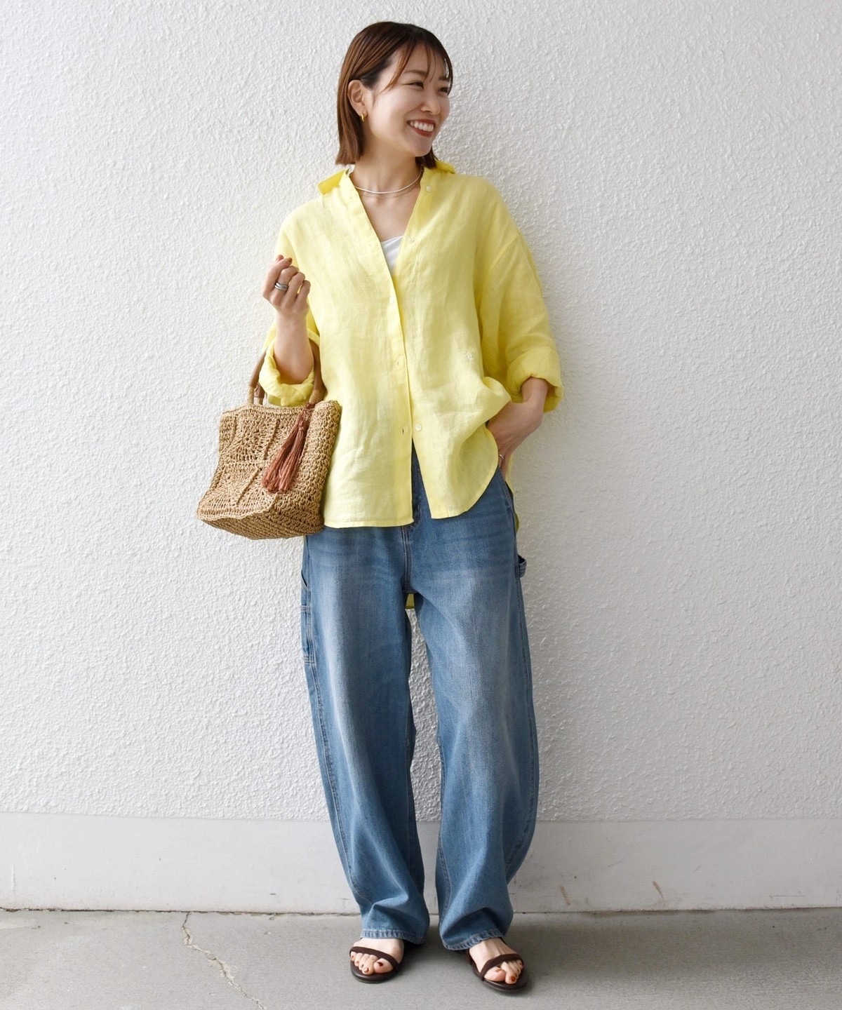 程良いリネンのシアー感があるので、キャミやタンクにさらっと重ねてヘルシーな着こなしがおすすめ。