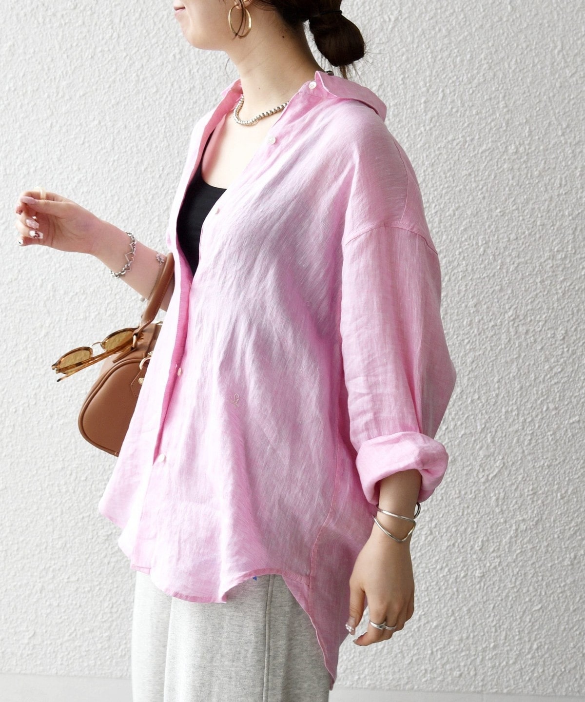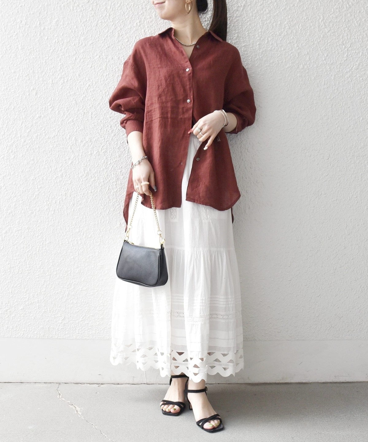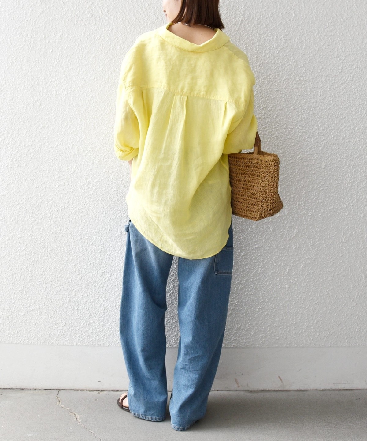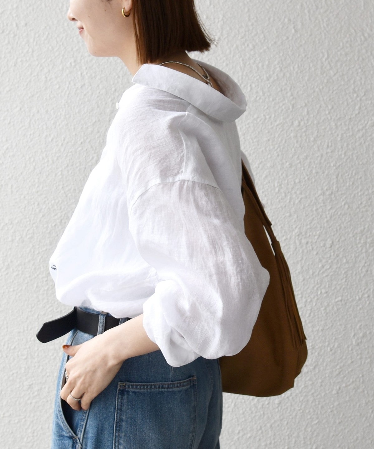 程良いリネンのシアー感があるので、キャミやタンクにさらっと重ねてヘルシーな着こなしがおすすめ。