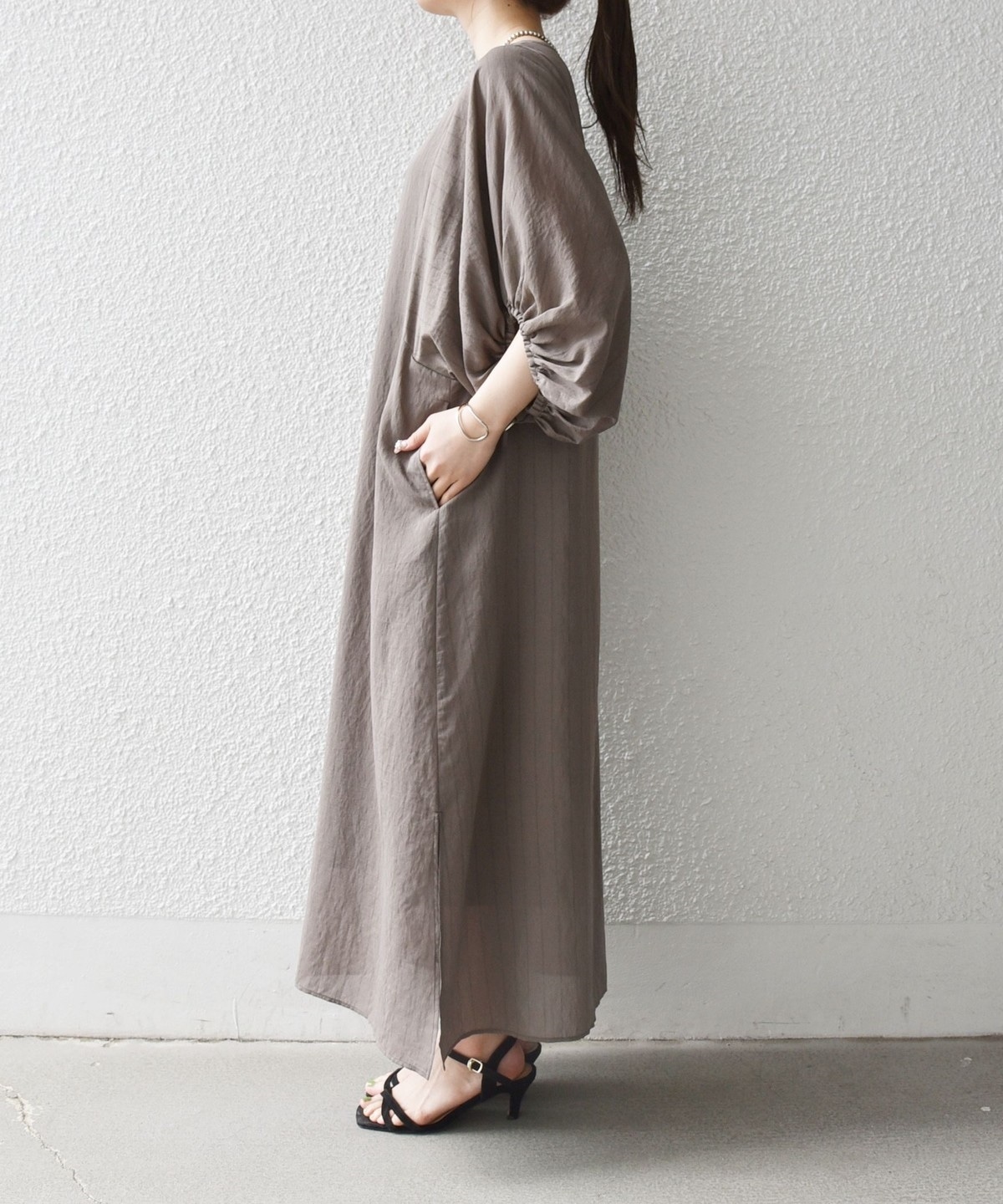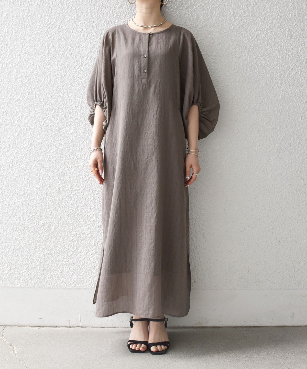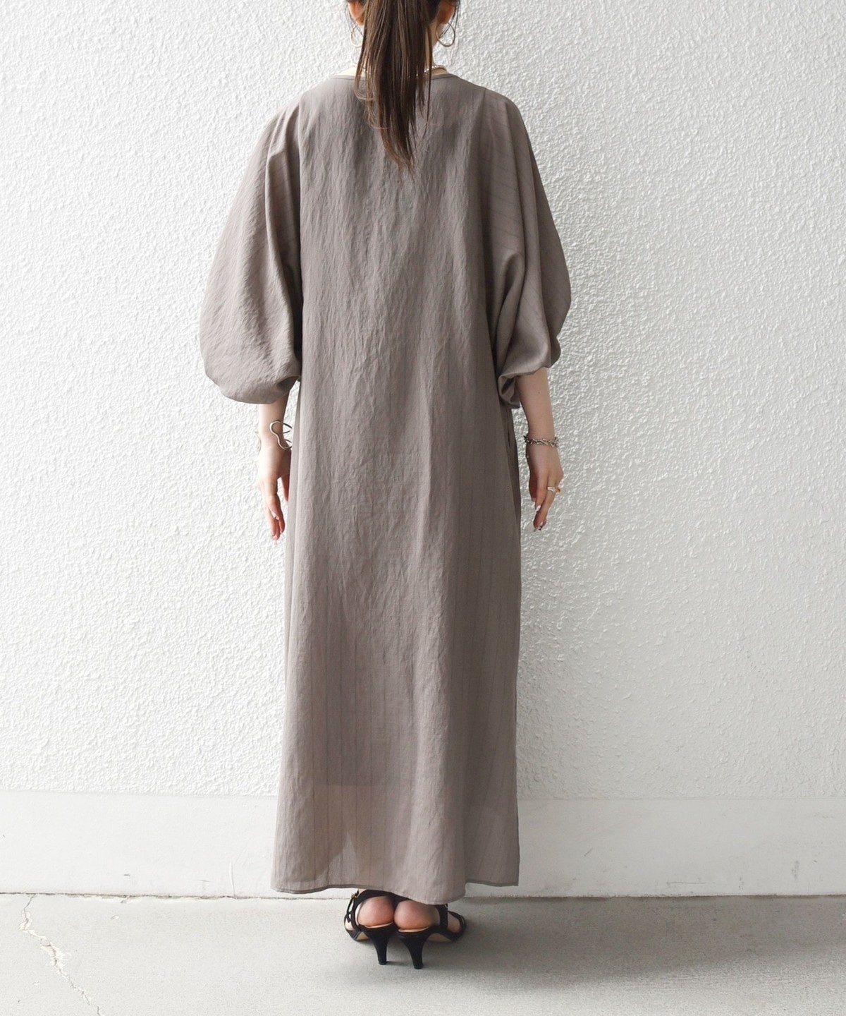 ボリュームスリーブとストレートシルエットのコントラストが魅力のシアーワンピース。