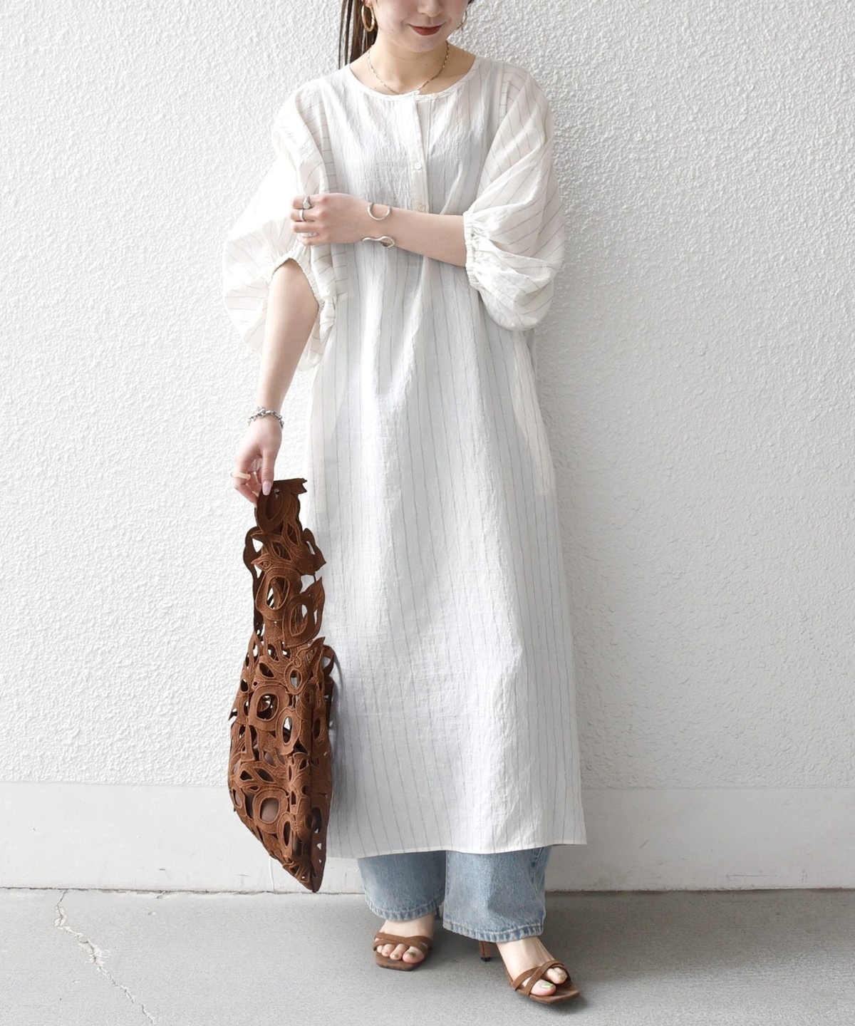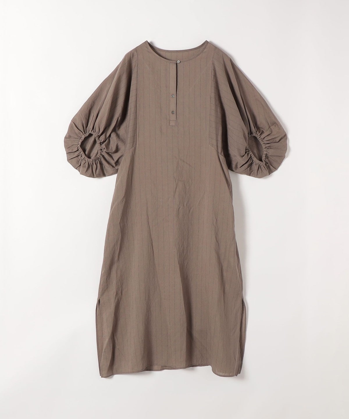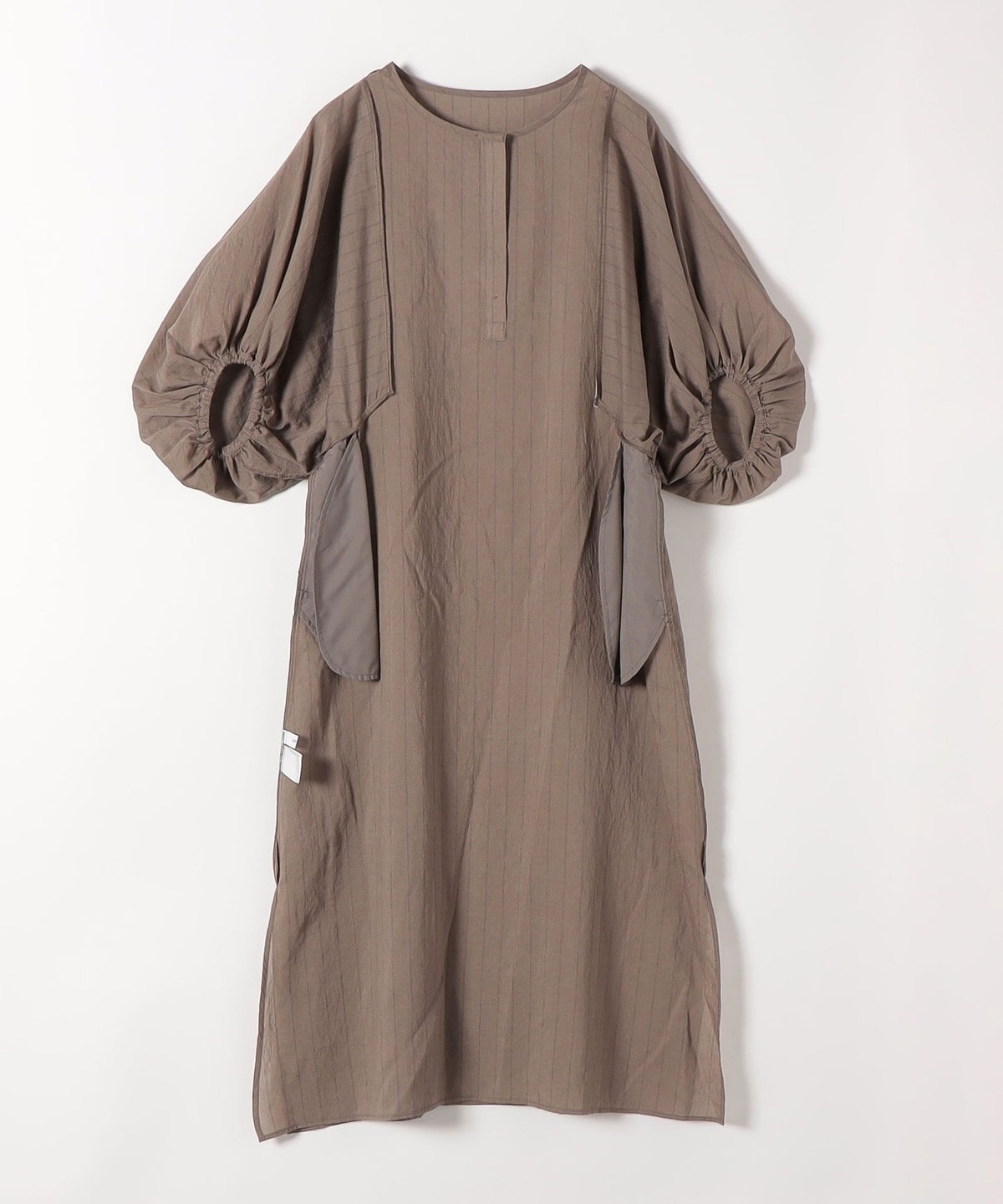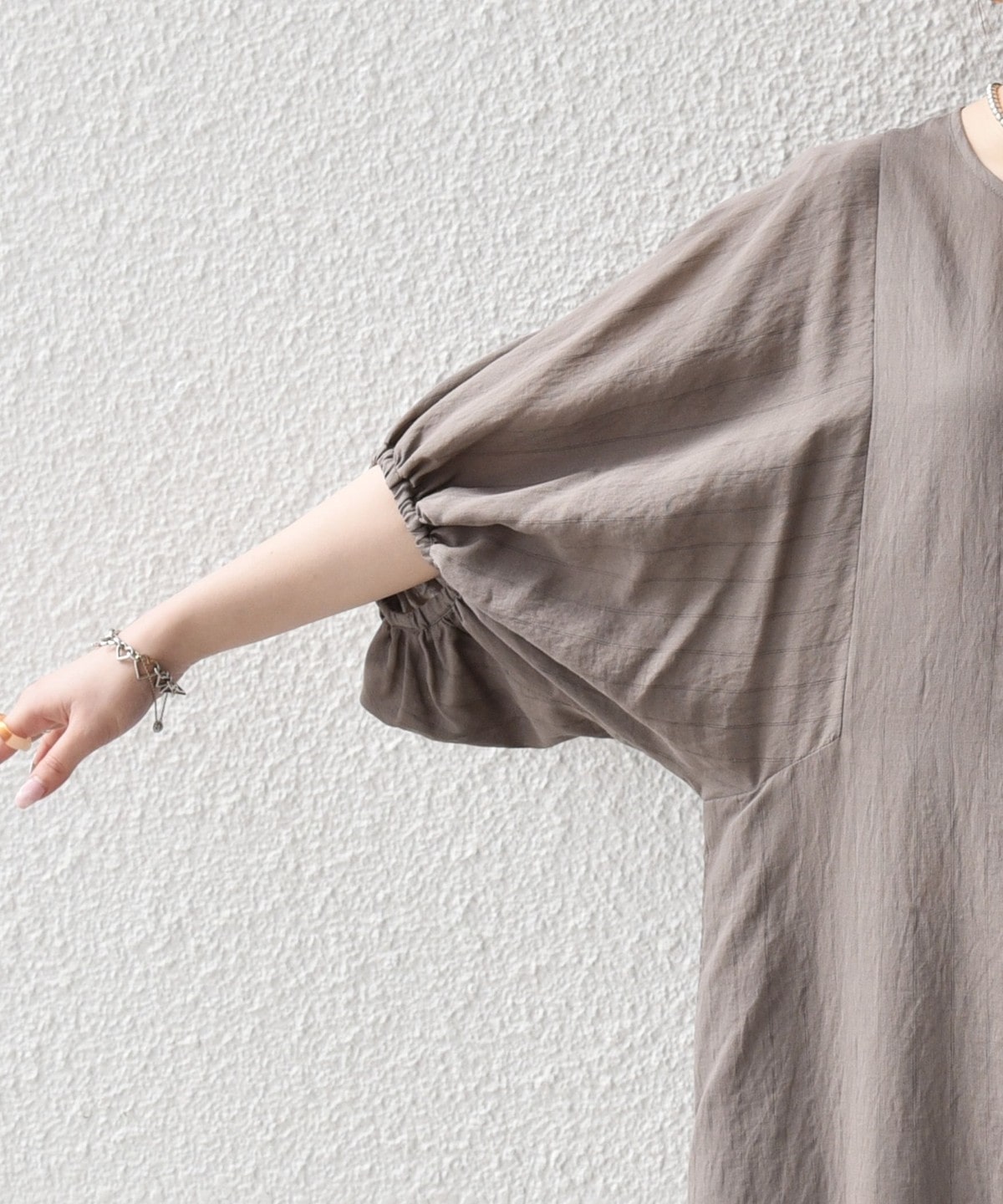 ボリュームスリーブとストレートシルエットのコントラストが魅力のシアーワンピース。