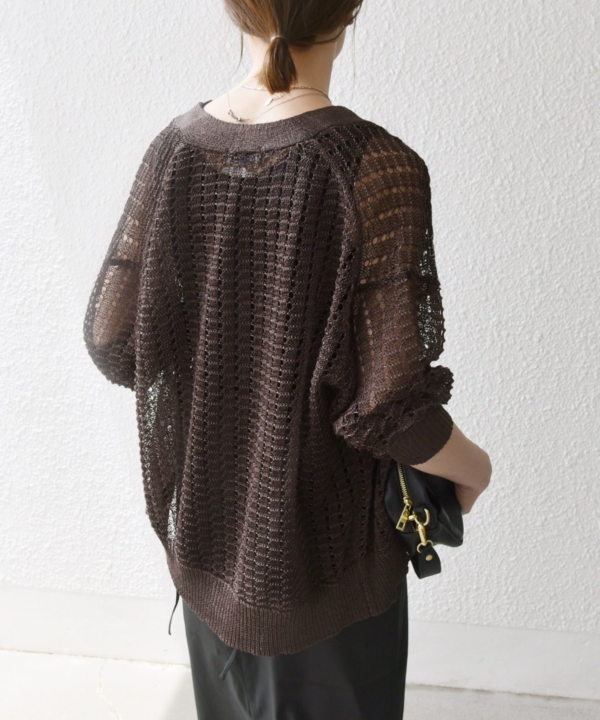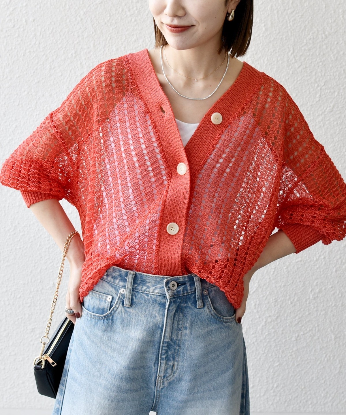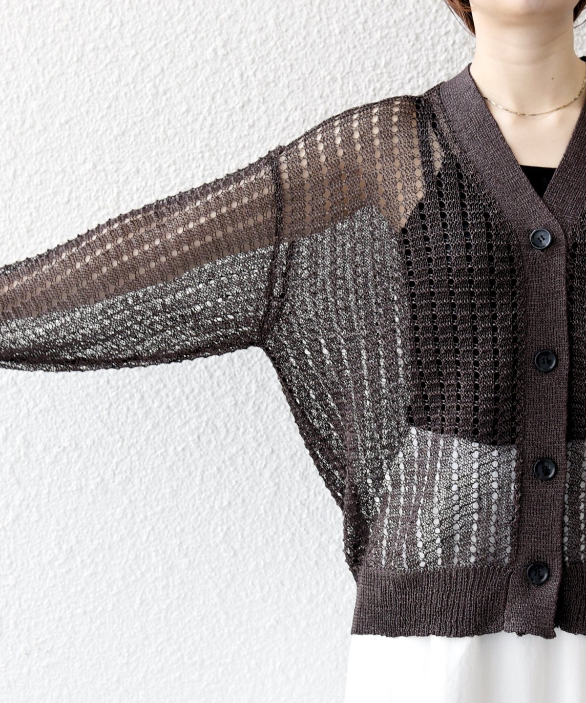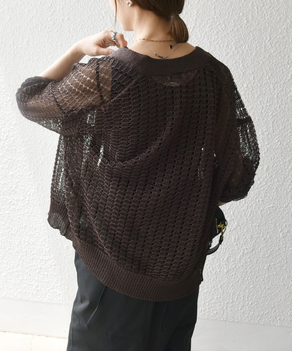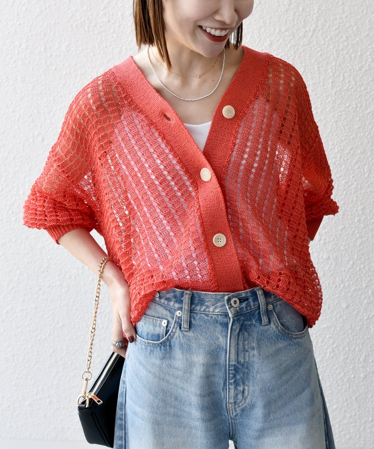 透かし編みで表現した表情のある編み柄がポイントのサマーニットカーディガン。