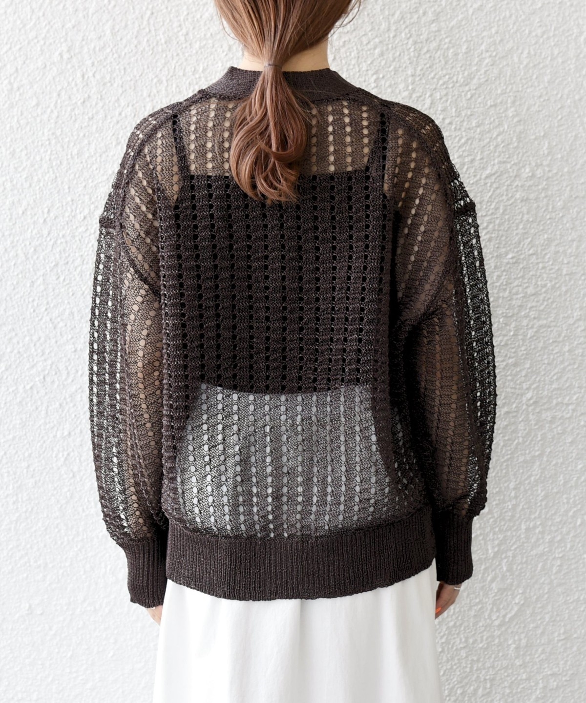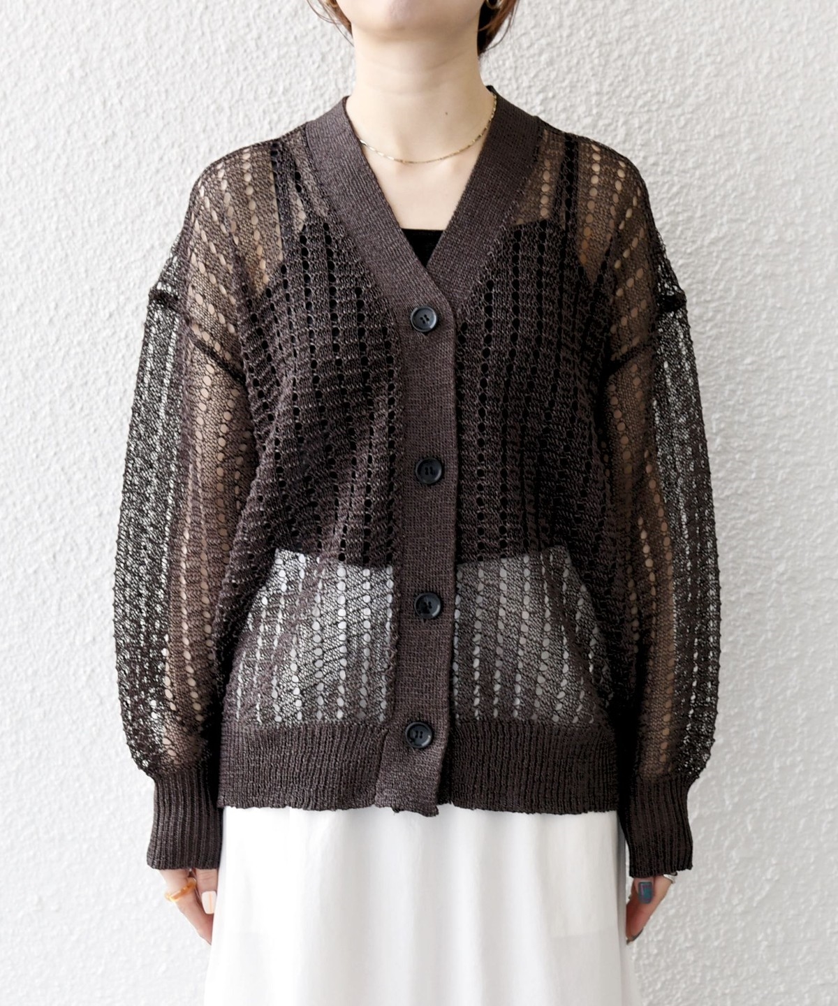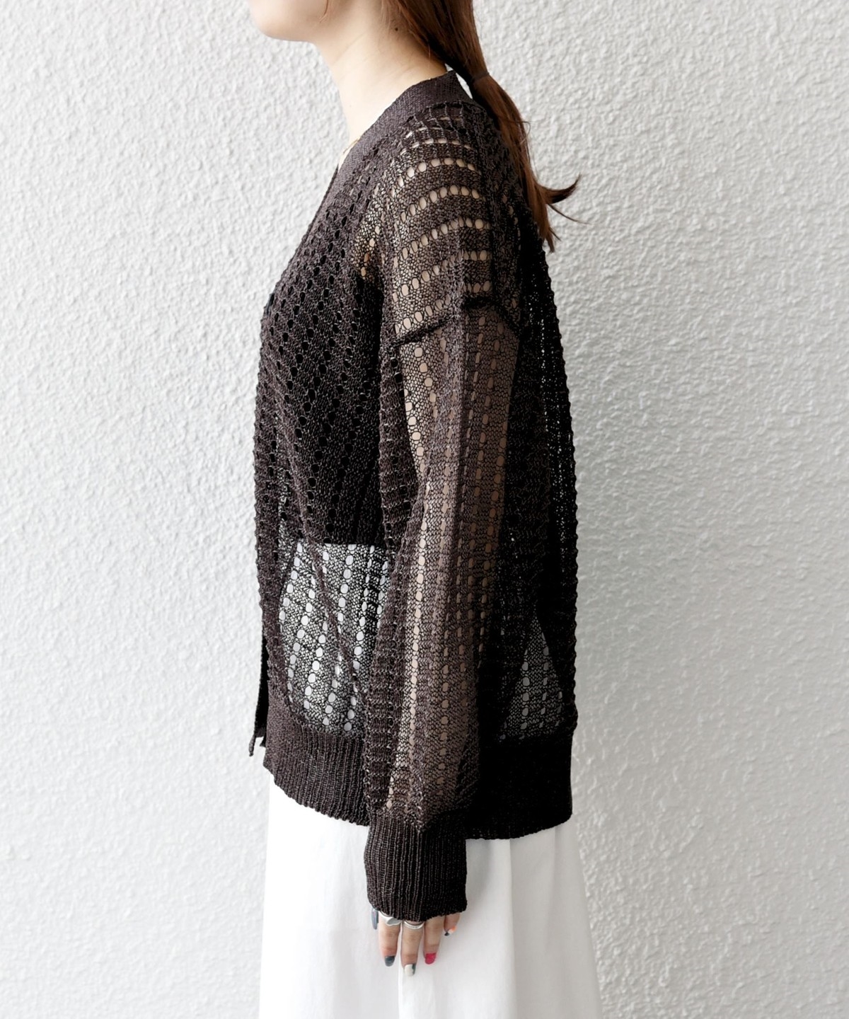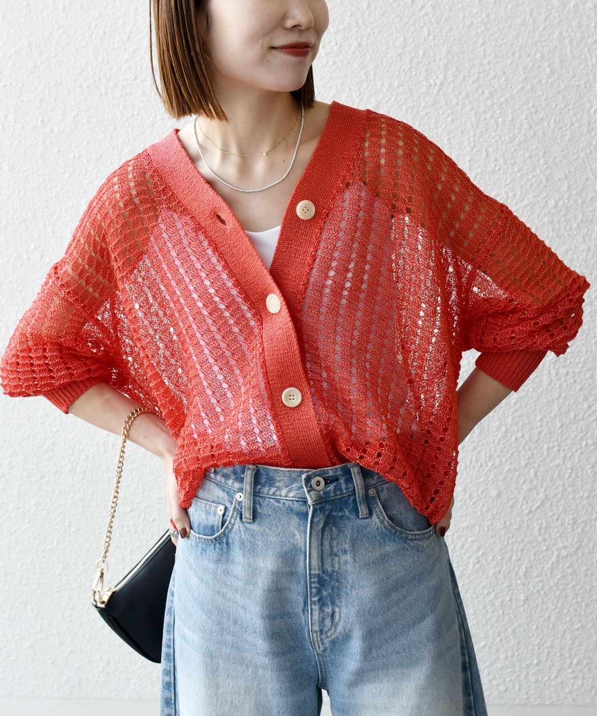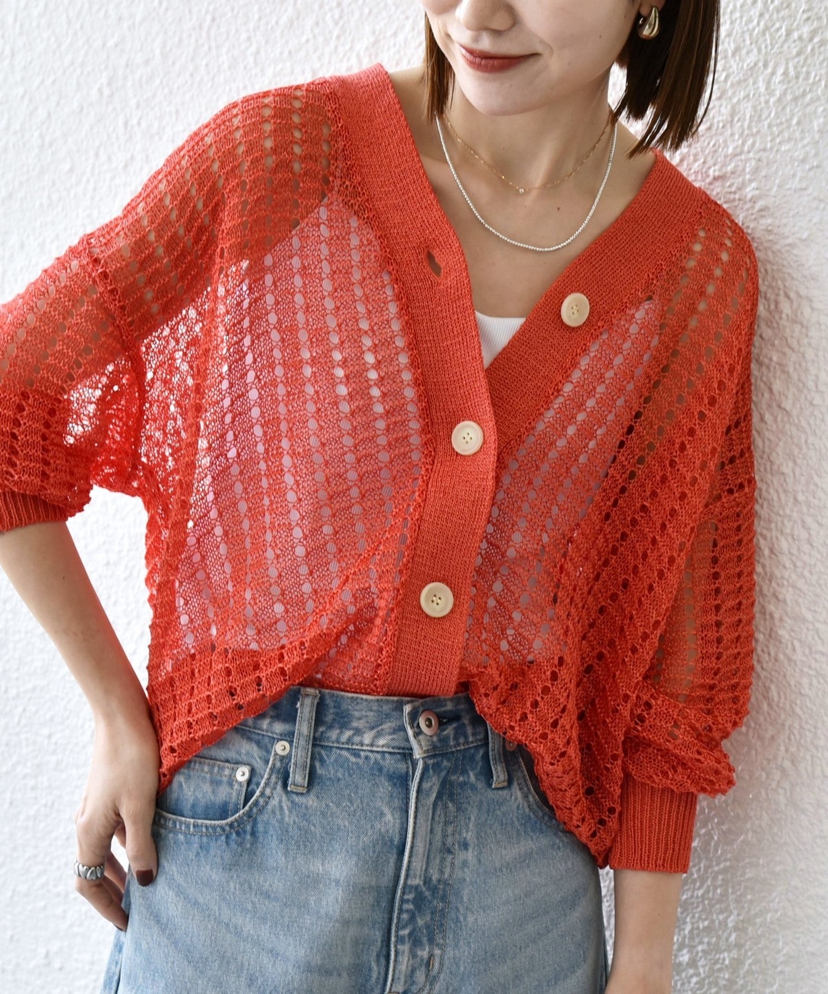 透かし編みで表現した表情のある編み柄がポイントのサマーニットカーディガン。