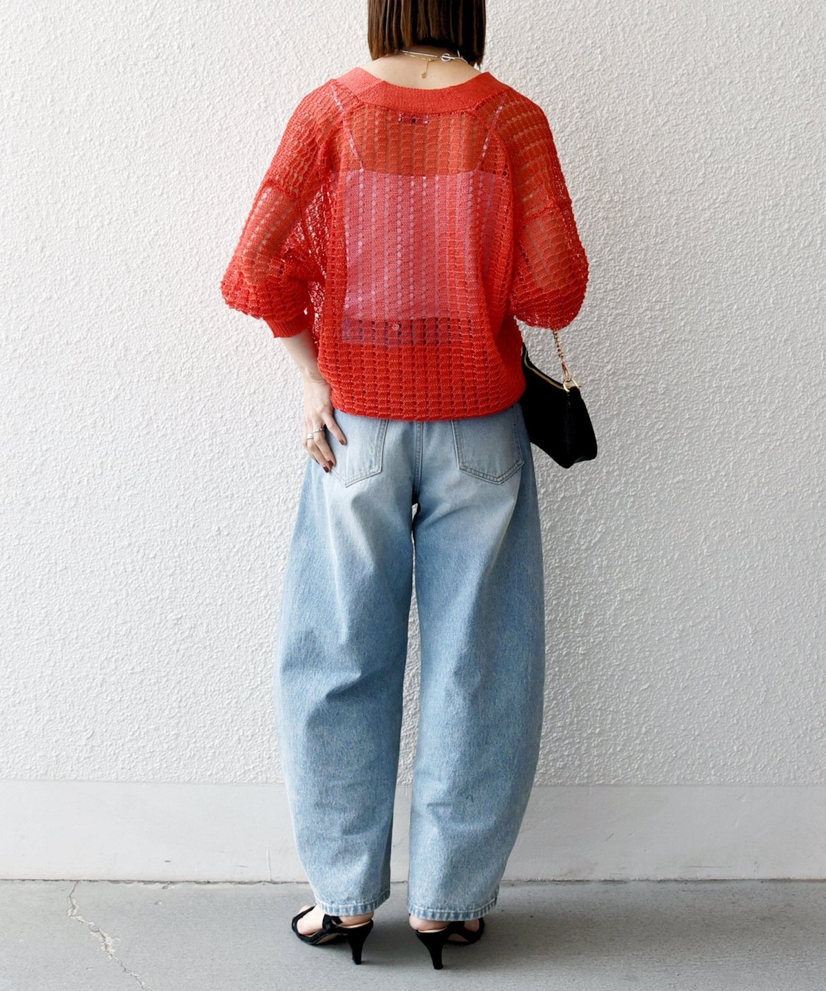 編地に特徴がありますが、あえてプリントのボトムを合わせた夏らしいスタイリングも◎