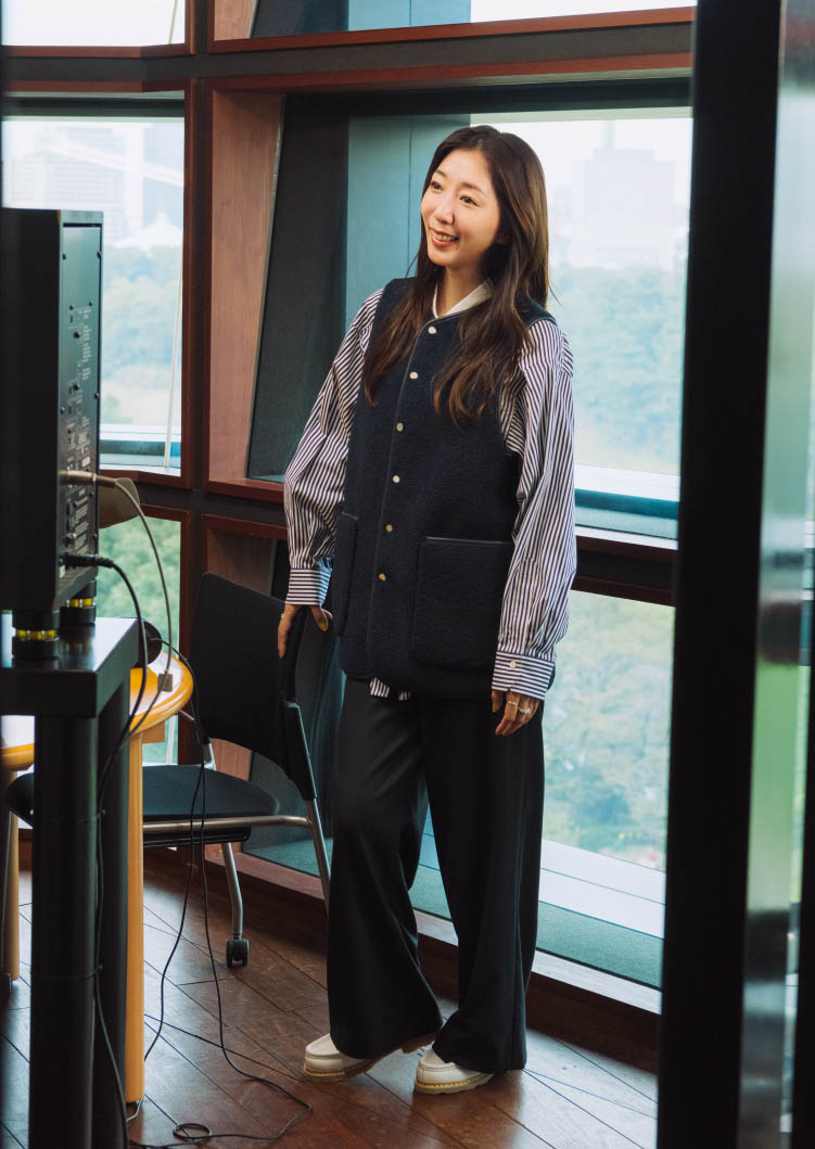 グレーのジャケットスタイルに、<セーラスタジオ>の手刺繍のスカーフをふわりと。冷えやすい首元をしっかり守り、やわらかな温もりをキープしてくれます。シンプルな色合わせの中で、クラフトの温度を感じる小物を一点添えることで、打ち合わせのワンシーンにもしなやかな個性が生まれます。